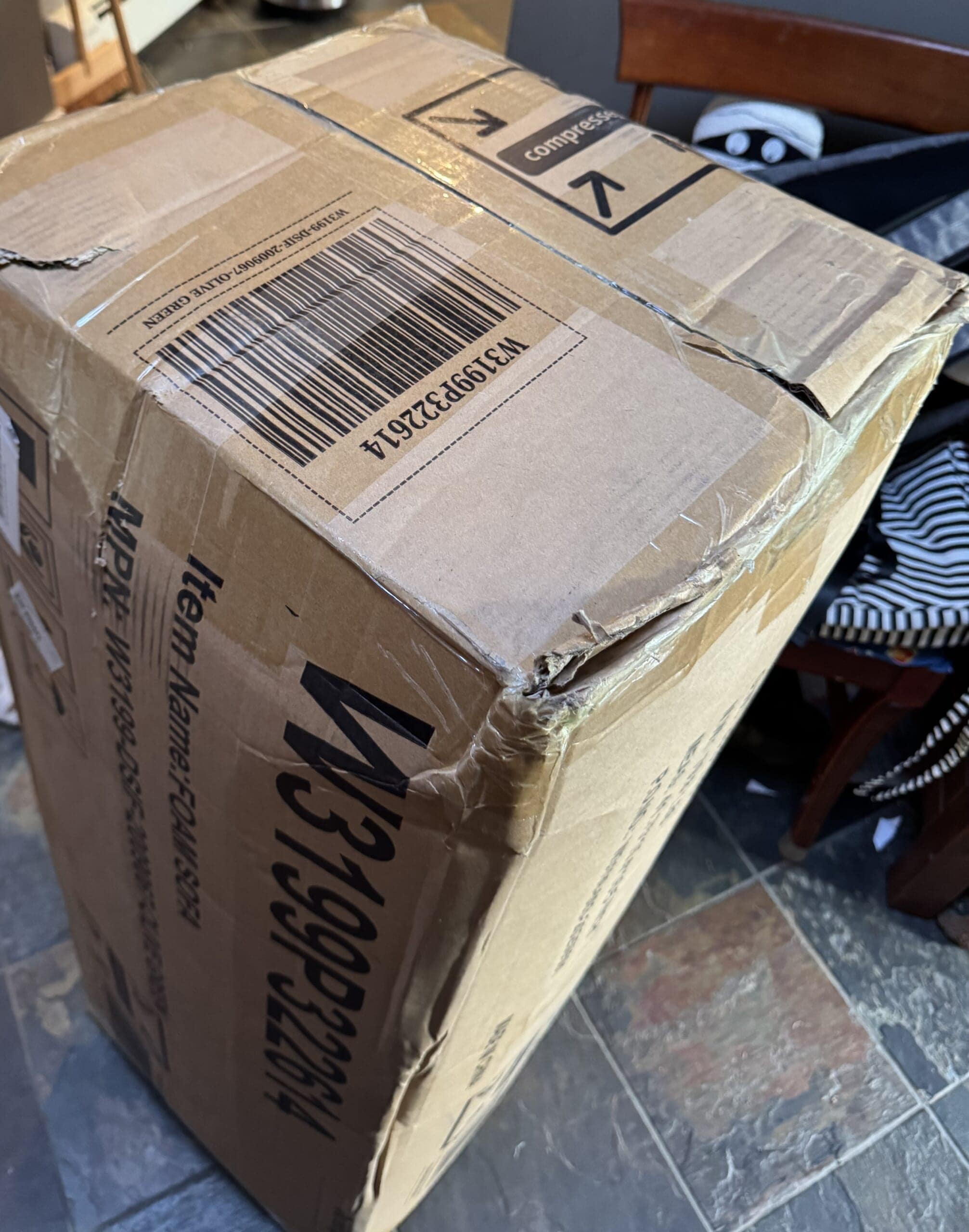 購入の決め手は配送時のサイズ。階段を通せるという点で決定。色のバリエーションがありすぎてちょっと迷いましたがグリーンに。家の前にポーンと置き配で届きました。160ドル弱の配送料ながら