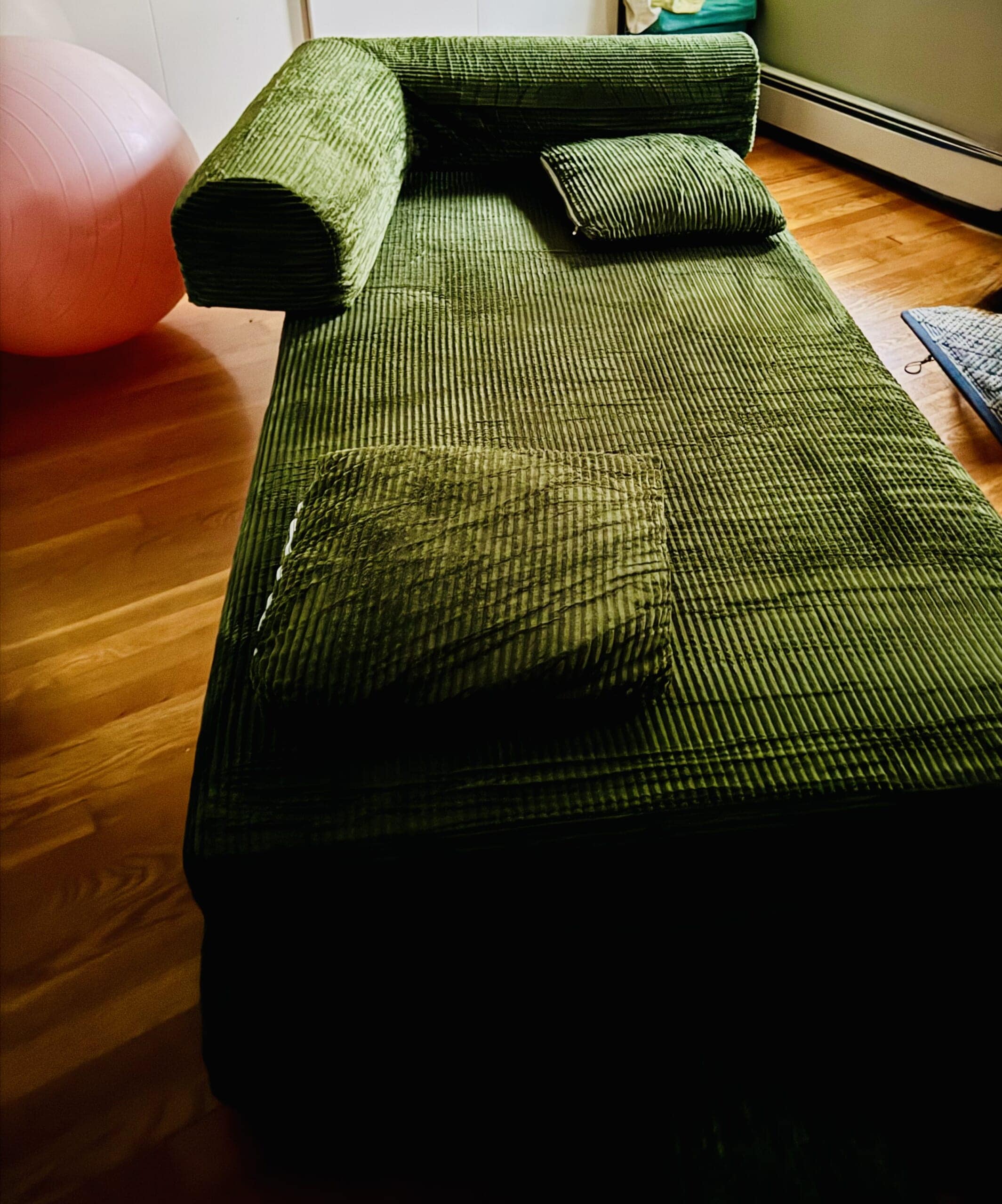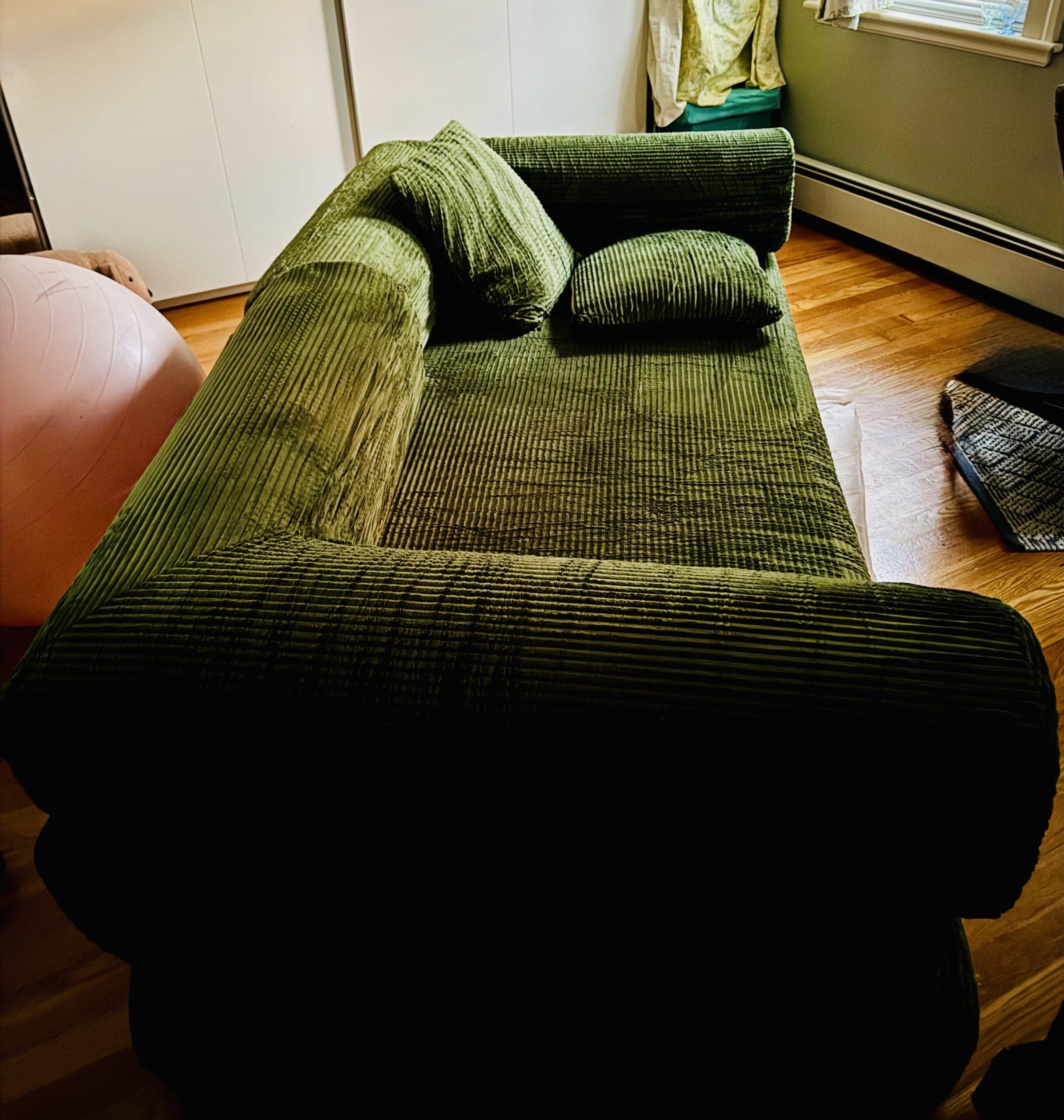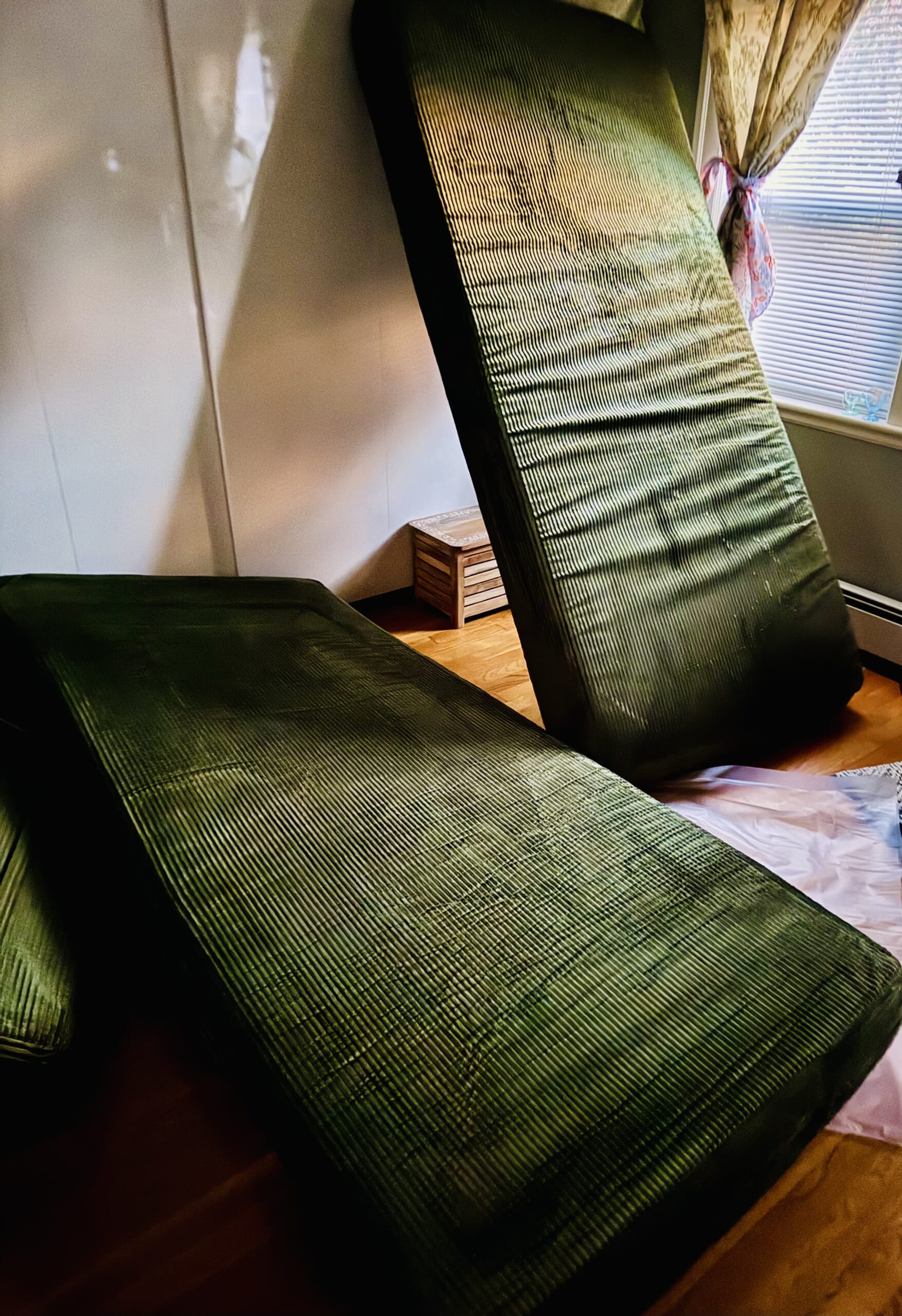 格闘の末ソファの形に。まだシワはあるけれど、良い感じの硬めのマットレスにグリーンコーデユロイが良い感じ❣️(開かずの間になっていた寝室の荒れ具合は置いといて)