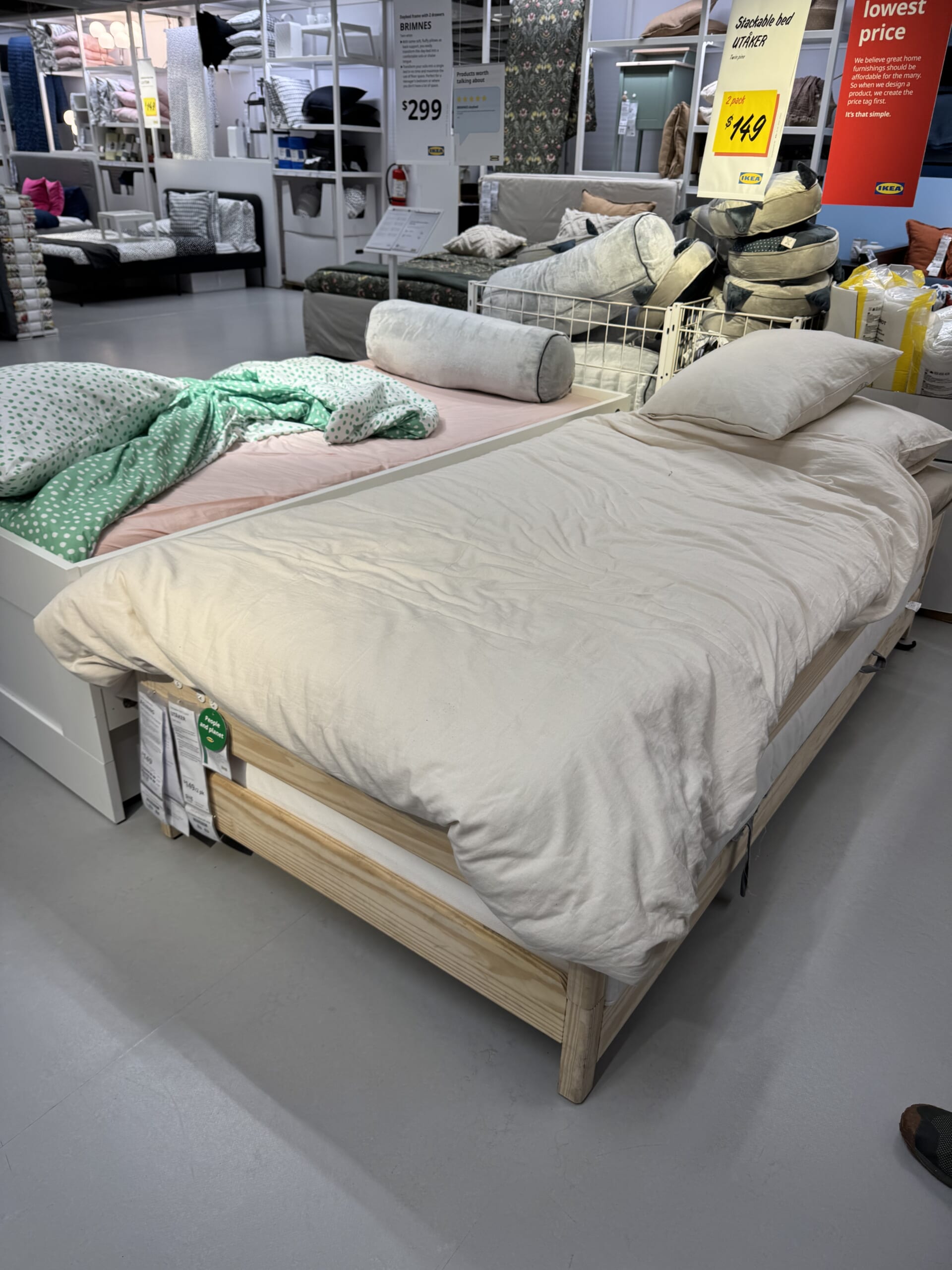 軽くて移動しやすそう。2人分くっつけて使えばダブルサイズベッドにできるのせ主寝室のメインベッドにしても良いし、子供1人づつ分けて使うこともできる。かなりこのベッドにする気になっていました。(売り場撮影可です)