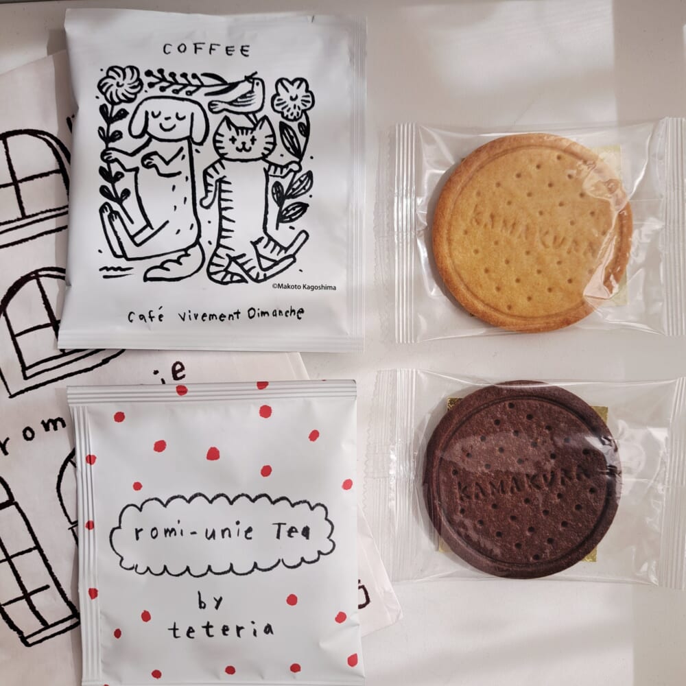 次の日とその次の日、お昼ごはんの後、こどもが帰ってくる前に ひとりでゆっくり噛みしめるように頂きました。カカオのクッキーは口に入れるとほのかにオレンジの香りが。この かわいいパッケージのコーヒーと紅茶は、まだ私のないしょのお菓子箱の中でスタンバイ中。