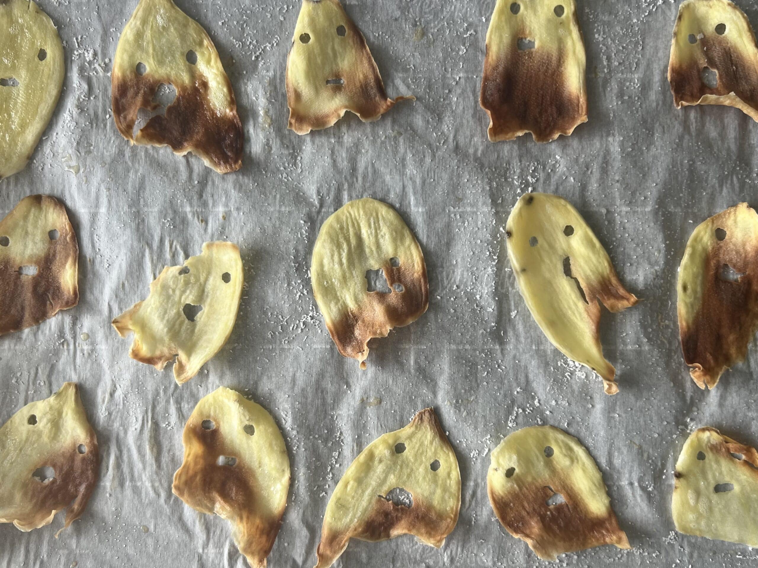 パリッと香ばしく仕上げたくて、おばけチップスの身体がうっすら茶色くなるまで焼きました。