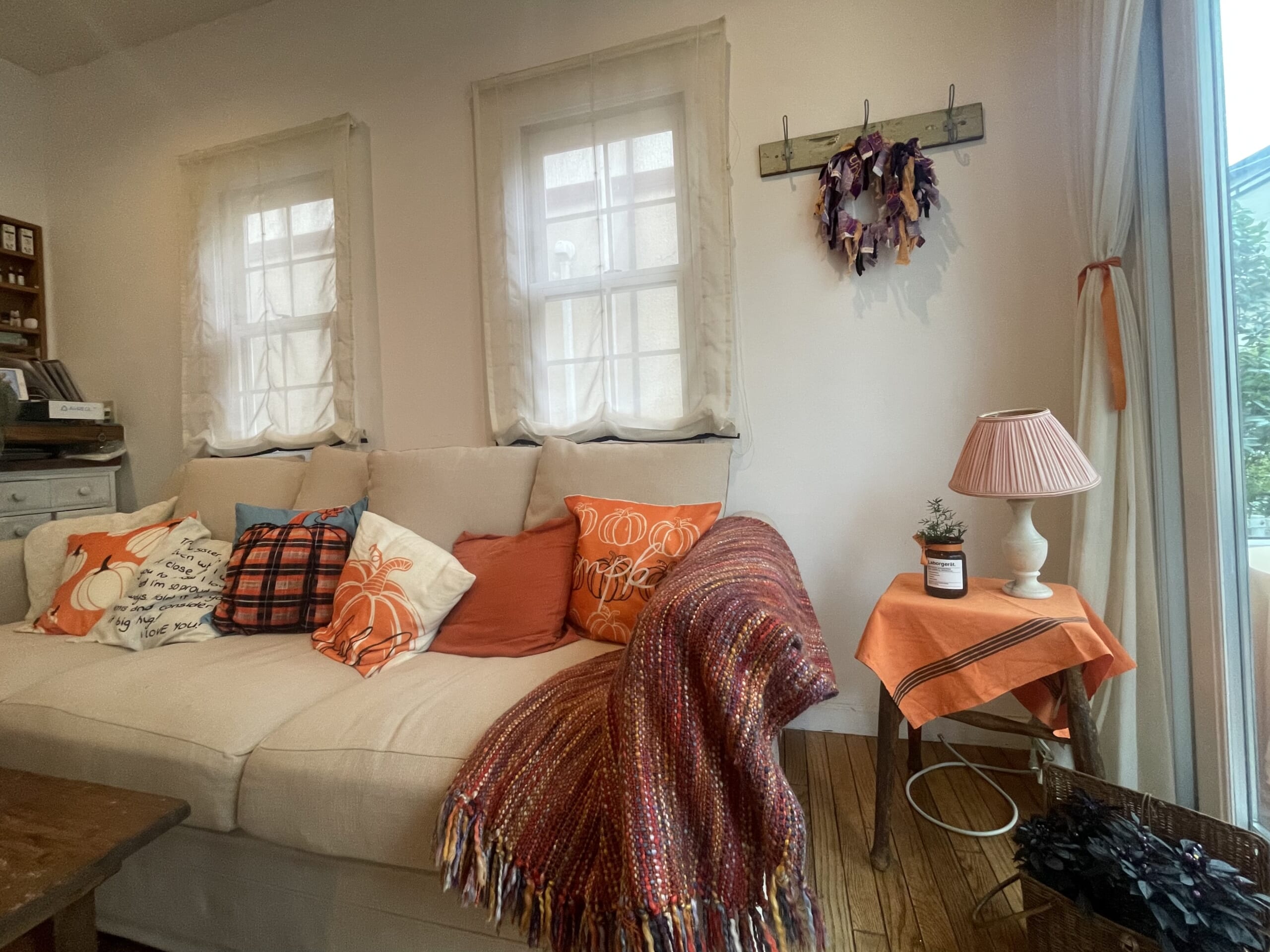 10月の店内はハロウィンをテーマに、オレンジを基調とした華やかで温もりのある装飾。秋の柔らかい陽射しがハロウィンらしいインテリアと溶け合う空間でした。