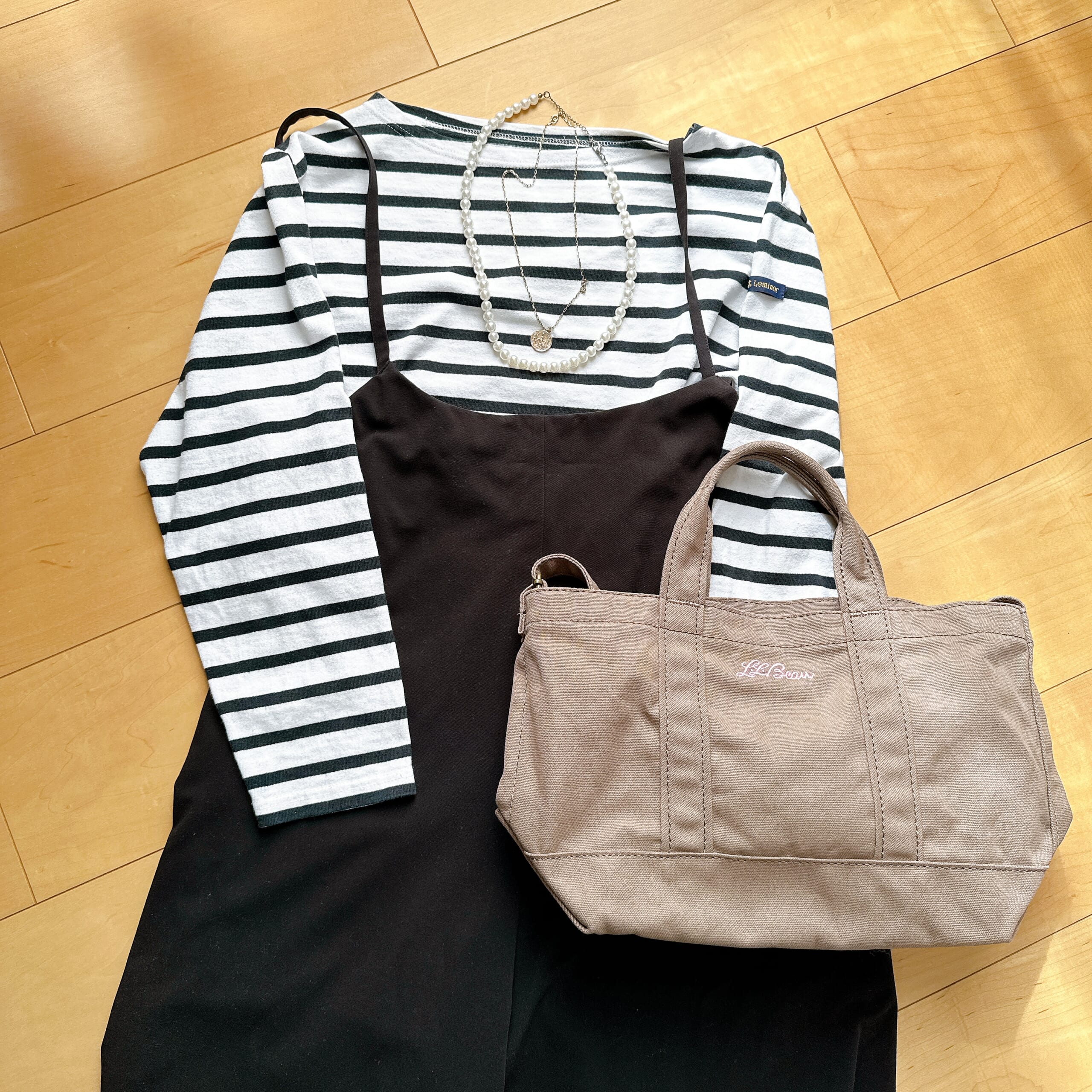 ボーダーカットソー(Le minor×IENA)と黒のサロペット(FRAMeWORK)のモノトーンコーデ。トレンドのブラウンがプラスされました!いやぁ~♡ピンクロゴも効いてますねぇ♡