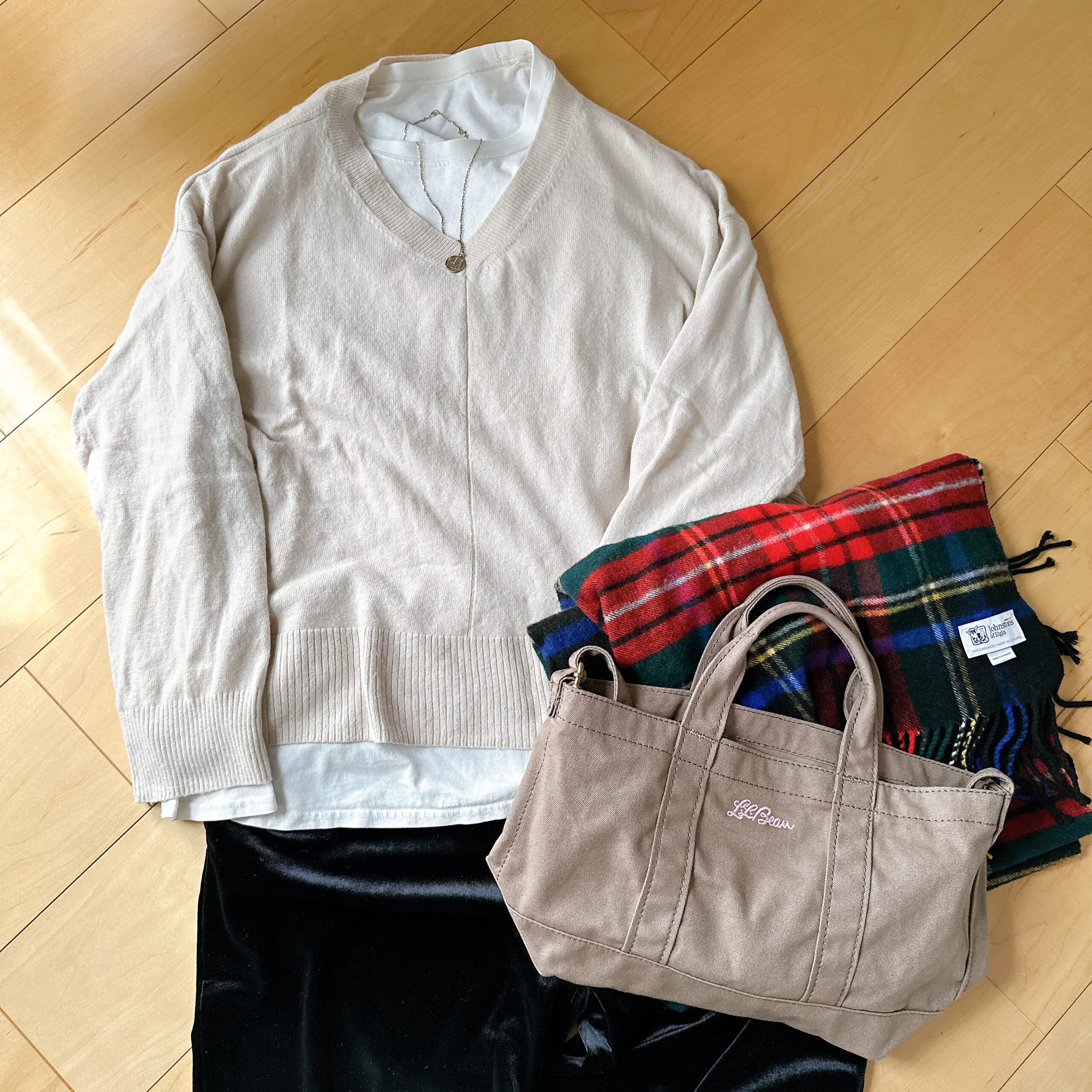 何年も大切に着ている カシミア混のVネックニット(green label relaxing) と、今秋のわたしコーデ登板率No.1のベロアパンツ(UNIQLO)のコーデです。