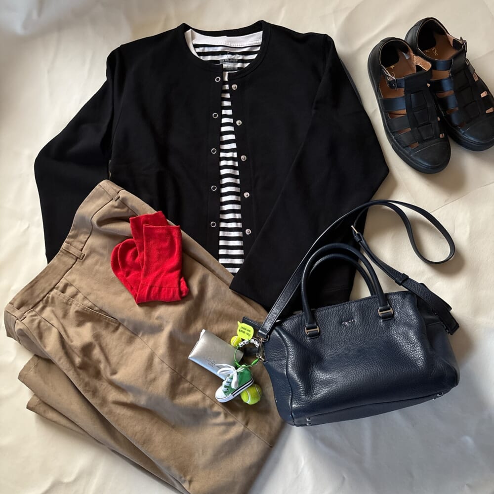 フレンチベーシックと言えば!!の白黒ボーダーに差し色で赤い靴下合わせ♡こちらのTシャツも無印良品のもの。プチプラだから日常のお洋服にガンガン着まわしたい。