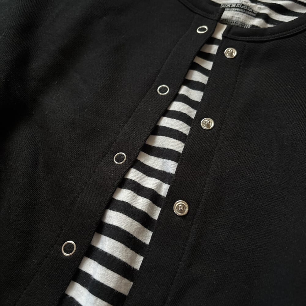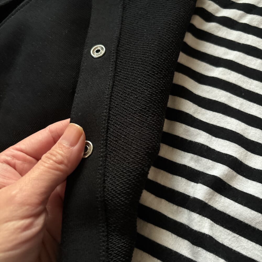 ボタンはスナップボタン。本家とは少し違うものの、シルバーのボタンがポイントになって良き。