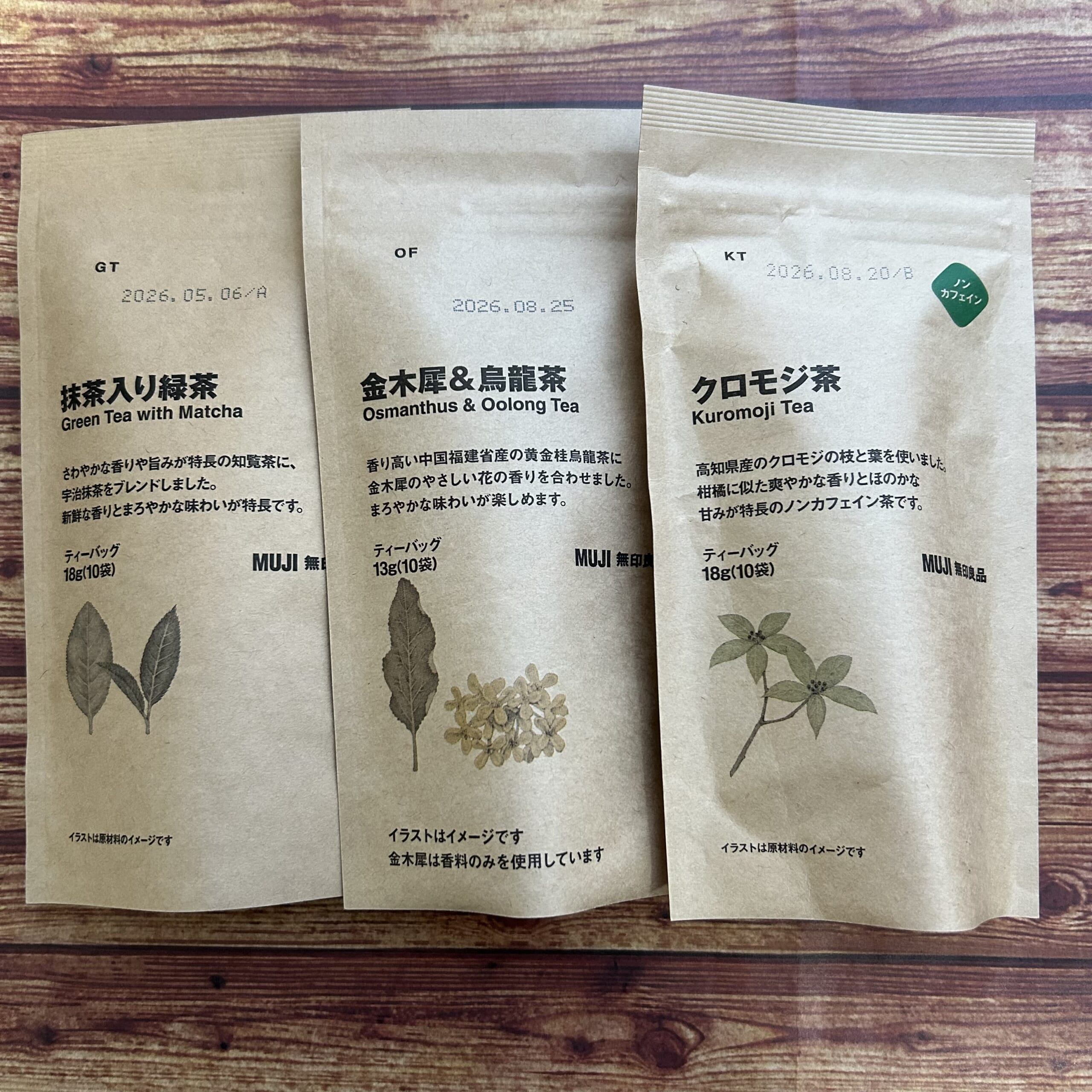 抹茶入り緑茶はリピート買いしてます。その他は初めて購入。金木犀&烏龍茶って珍しい!香りを確かめると(テスター的にティーパックが置いてありました!)、とてもいい香りがしたのでカゴにin。クロモジ茶は…身体に良さそうで購入。