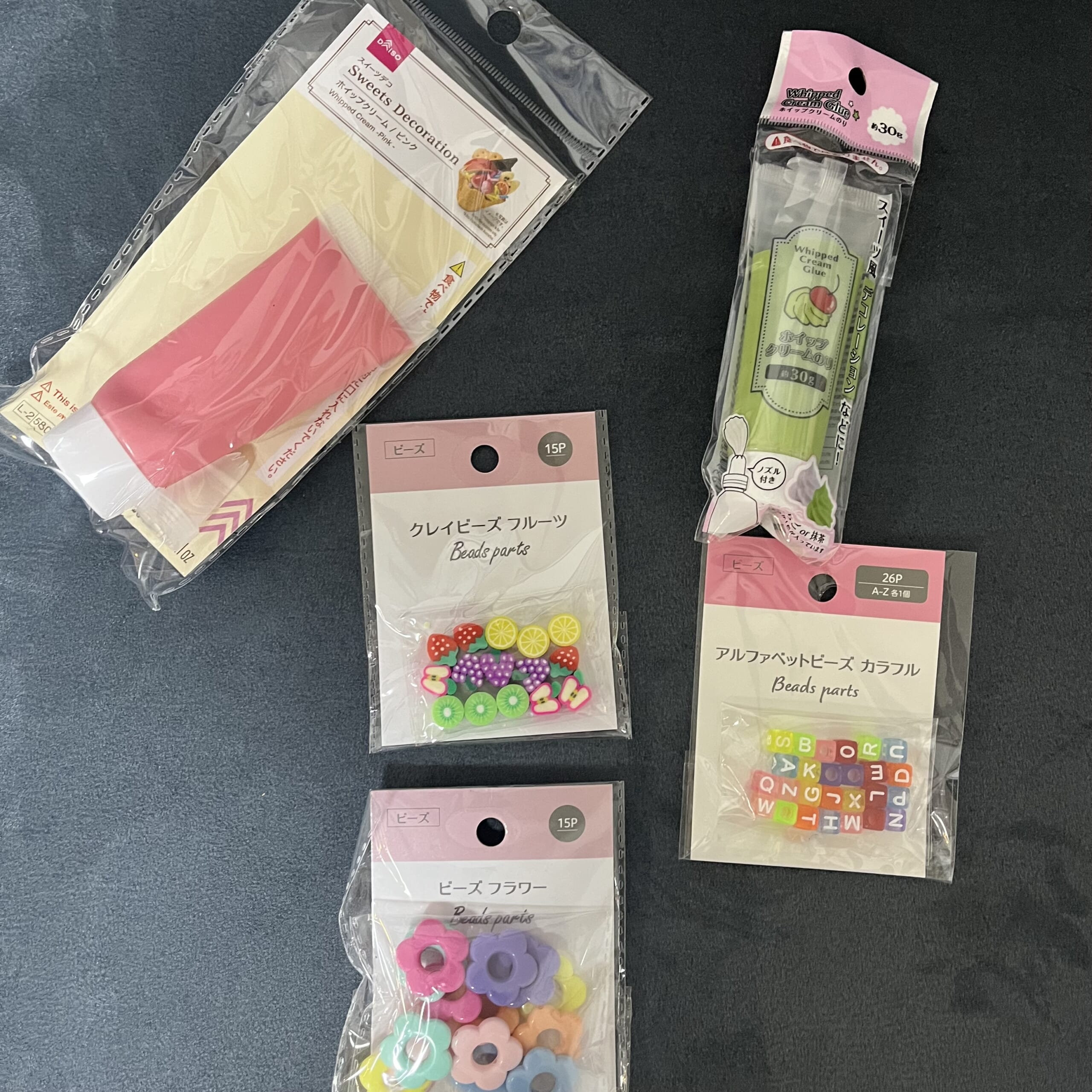 ダイソーで、色付きホイップクリームと、付けたいパーツを買いまして、、