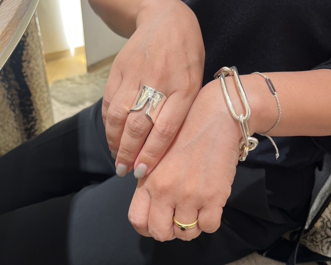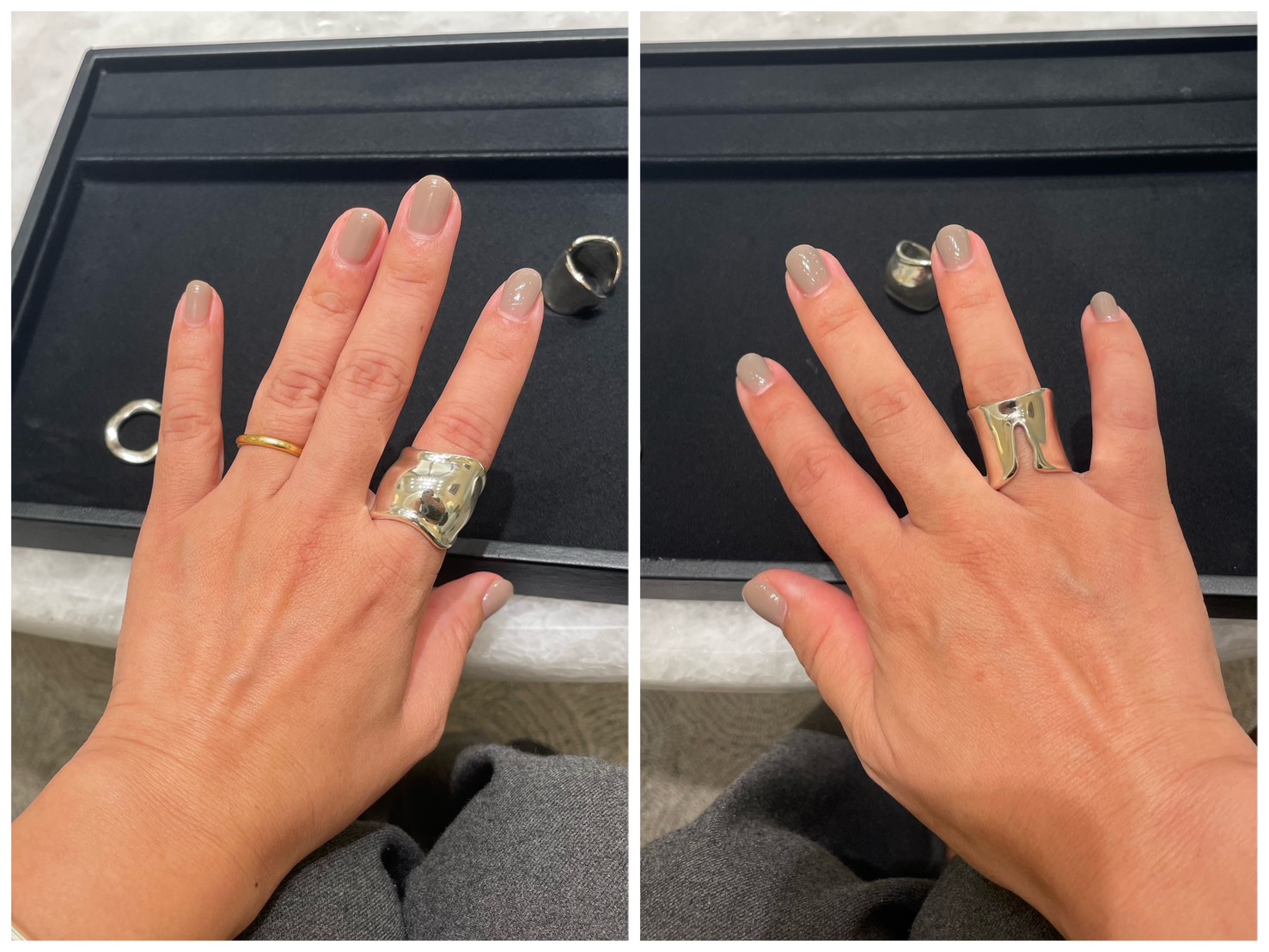 このリングをそのまま大きくしたようなバングルも以前からあるんですが、幅広でめちゃくちゃかっこいいんです!! でも、日常使いにはちょっと臆してしまうボリューム感。わたしにはリングで取り入れるのがちょうどいいバランスでした。