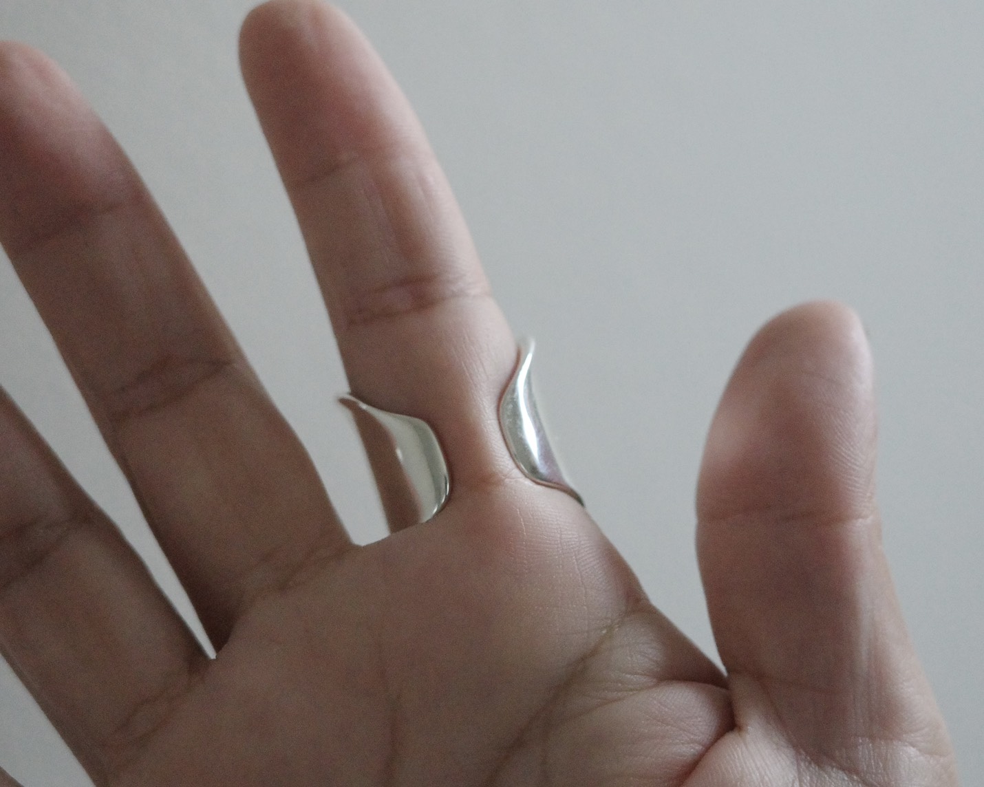 右は、「スプリット リング」の1つ小さいサイズを薬指につけたところ。1つサイズが違うだけで結構フィット感が違うんですよね〜(キツそう!!)