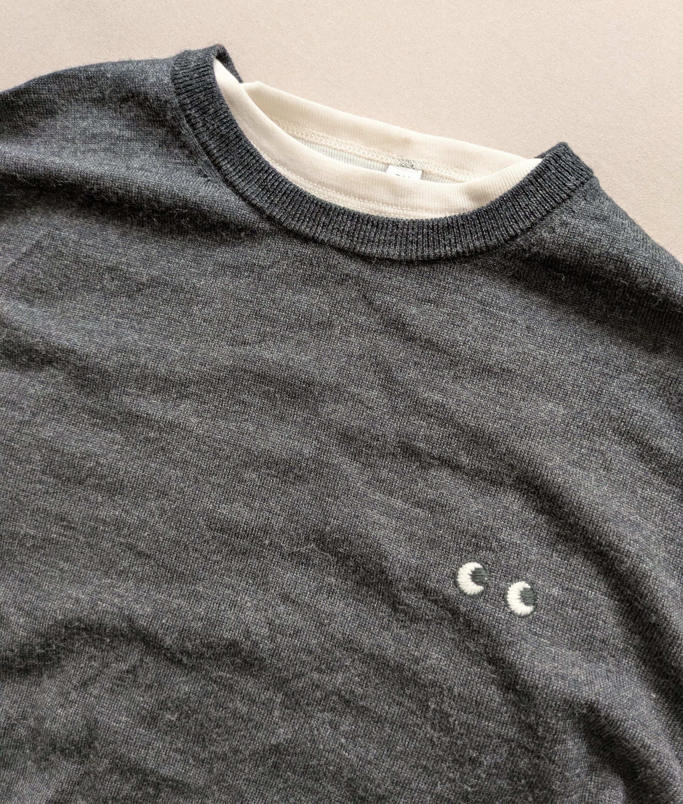 メリノクルーネックセーターとレイヤードコーデ
