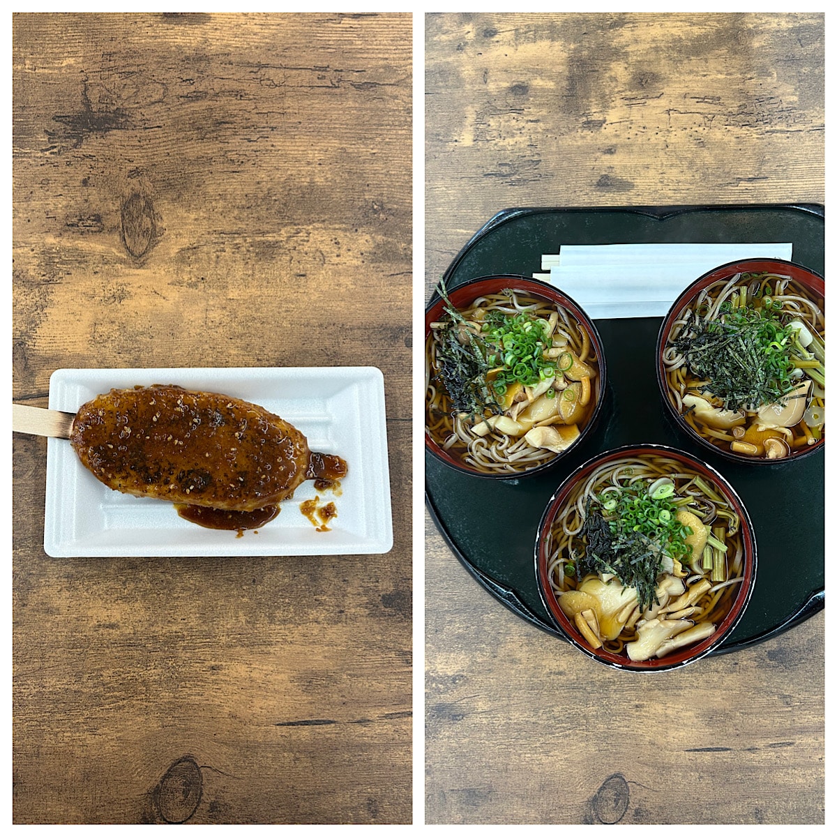 食堂でいただいた五平餅と山菜きのこ蕎麦。あったまっておいしかった~。