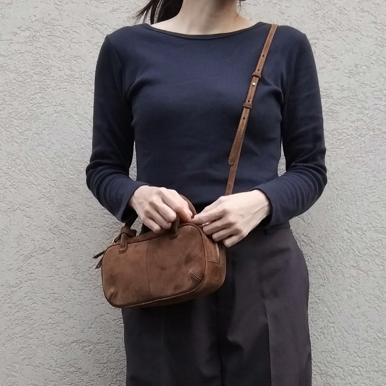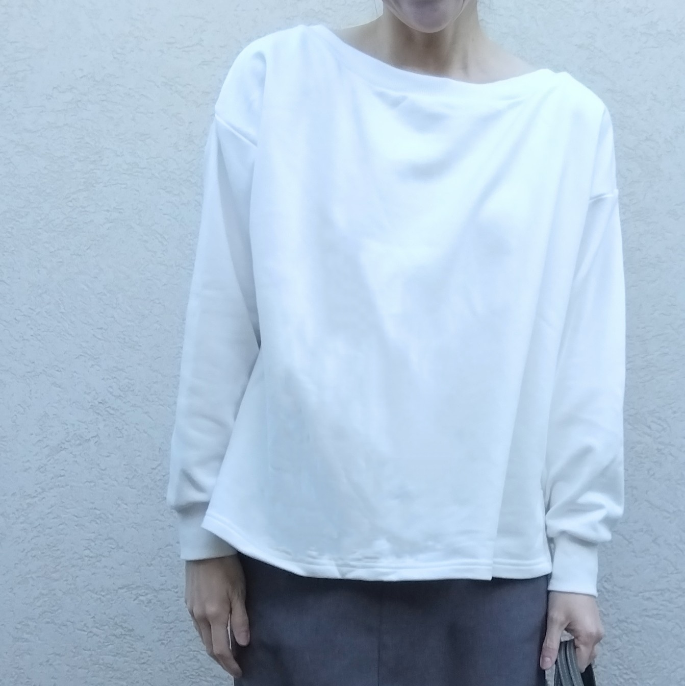 スウェット素材だけどちょっときれいめ?通常のクルーネックと違い首元が広めに開いています。オフショルにもなるけど広めのボートネックって感じかな。