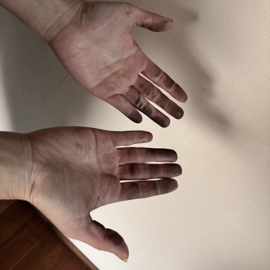タイヤ交換の為に素手でタイヤを運んだらこんな事に。良い子は軍手履くんだぞ!あれ?手袋履くって北海道弁だっけか?