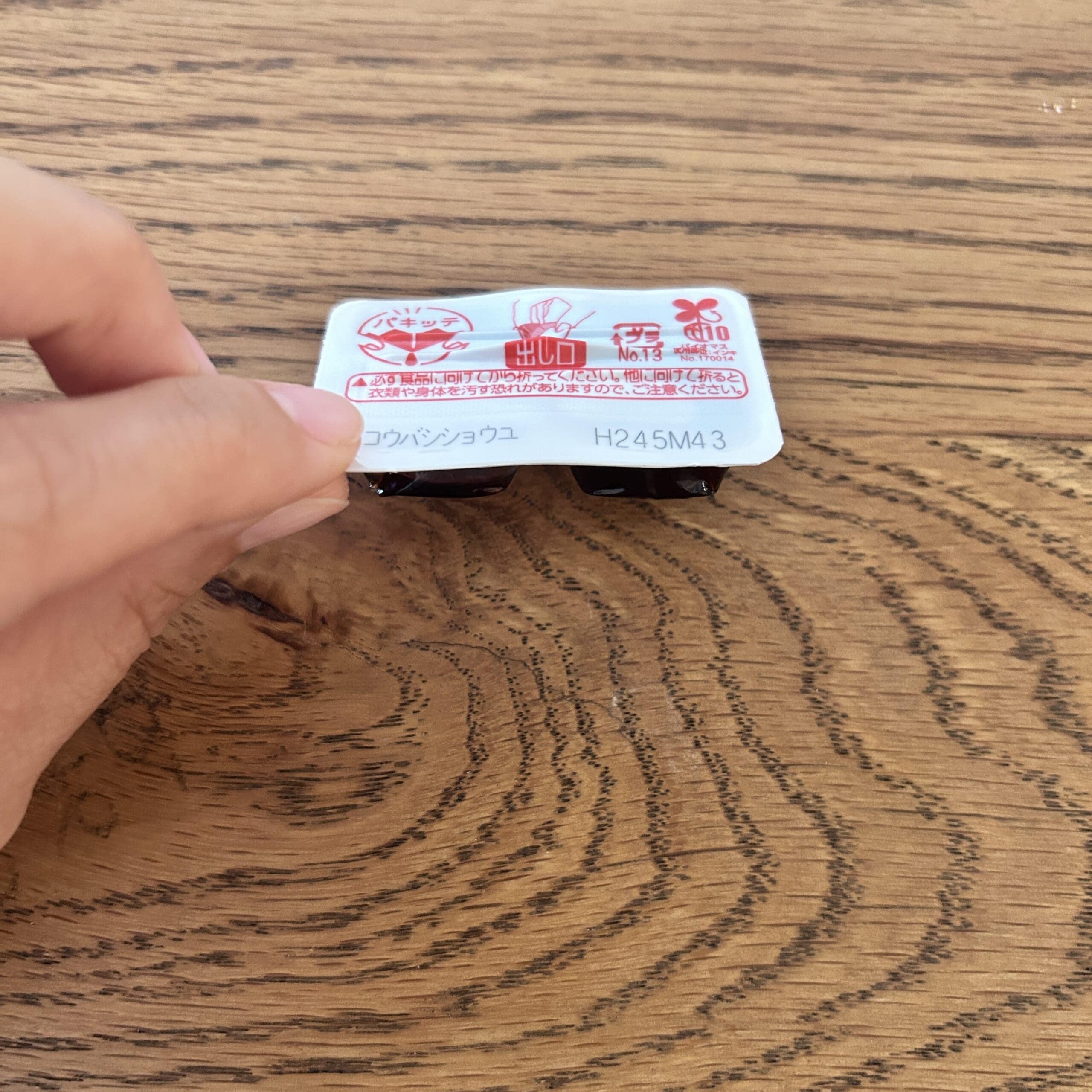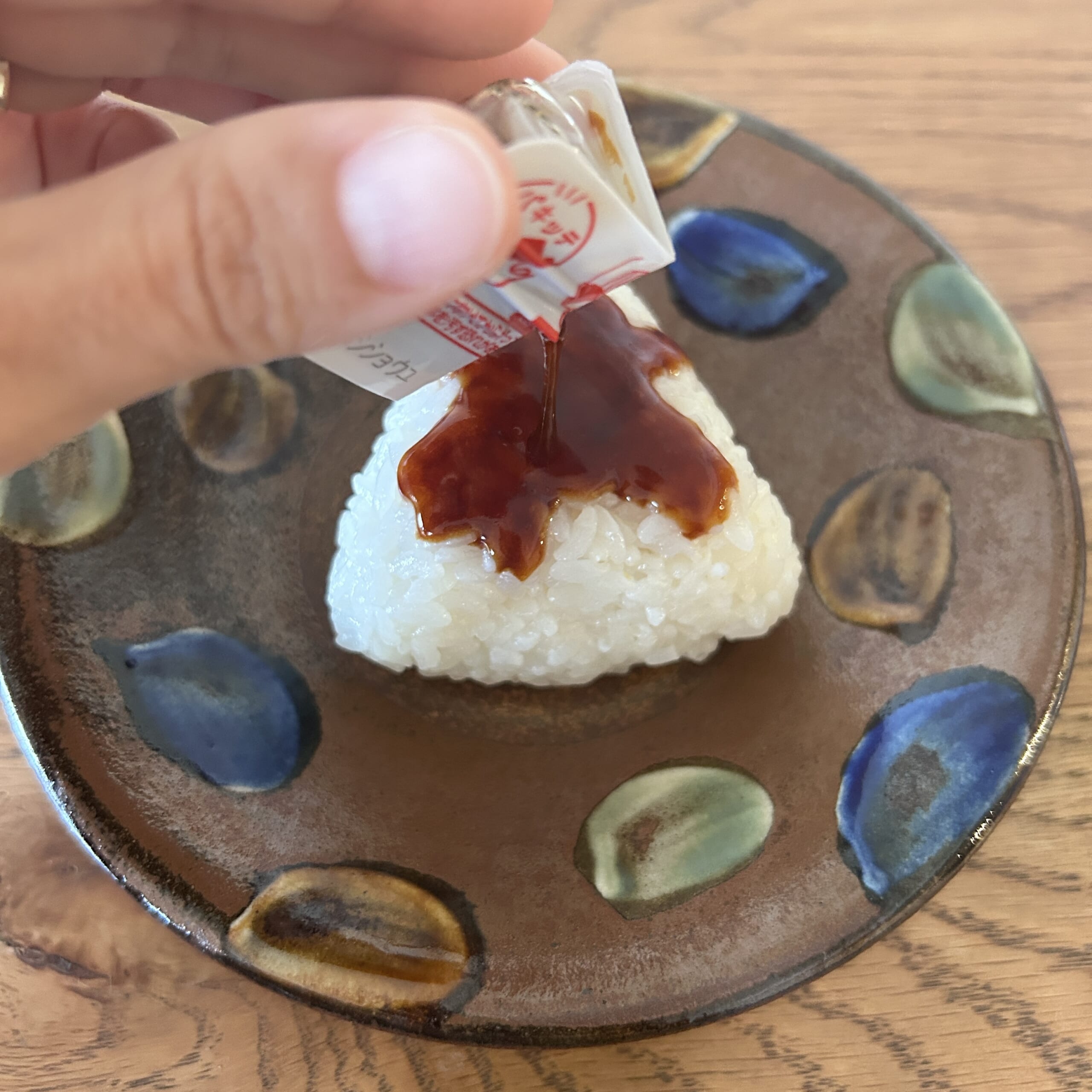 よくケチャップとマスタードが入ってるような、パキッと折って使う、パッケージが並んでおります。中身は香ばし醤油。1個でおにぎり2個分。