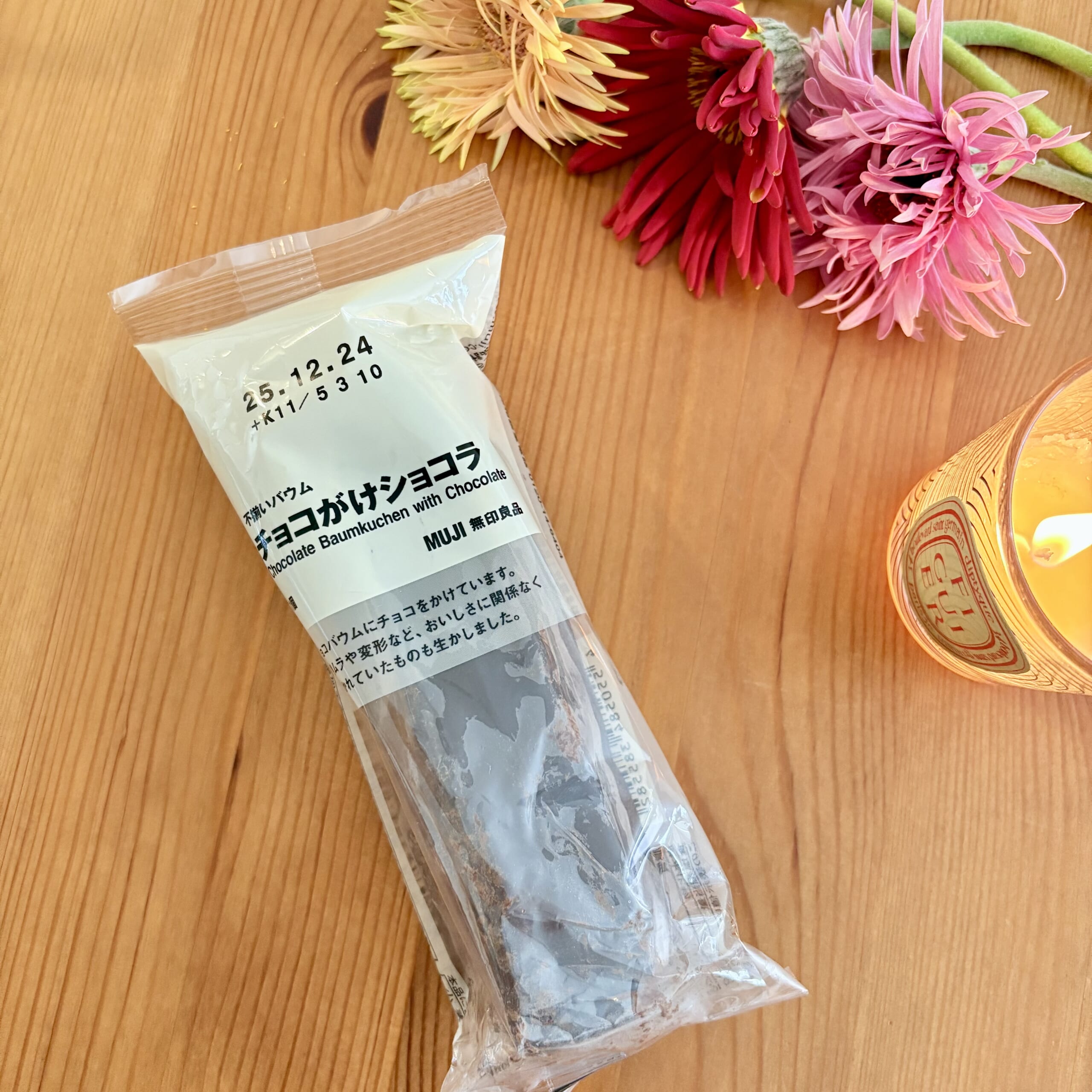 定番不揃いバウムは「チョコがけショコラ」。新商品なのか、店頭にたくさん並んでいました。チョコ好きにはたまらないダブルチョコ♡ミニサイズもありましたが、ミニではあっという間になくなりそうなので通常サイズ。