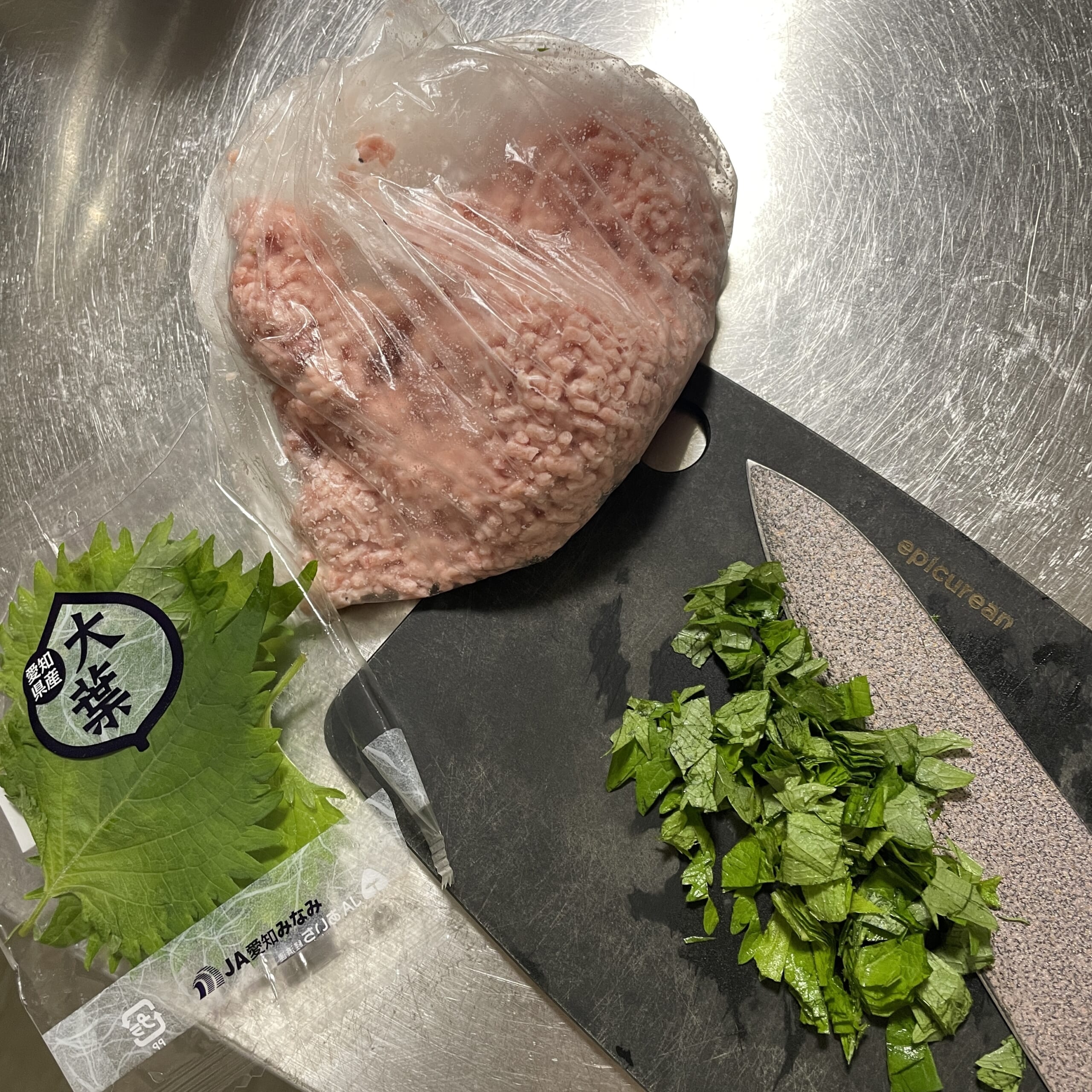 ひき肉をマヨネーズなどの調味料とポリ袋で合わせ、マフィンに塗り、フライパンで焼くのですが、これがまたおいしい!アクセントに大葉が入ることによってちょっと燻製っぽい味に。