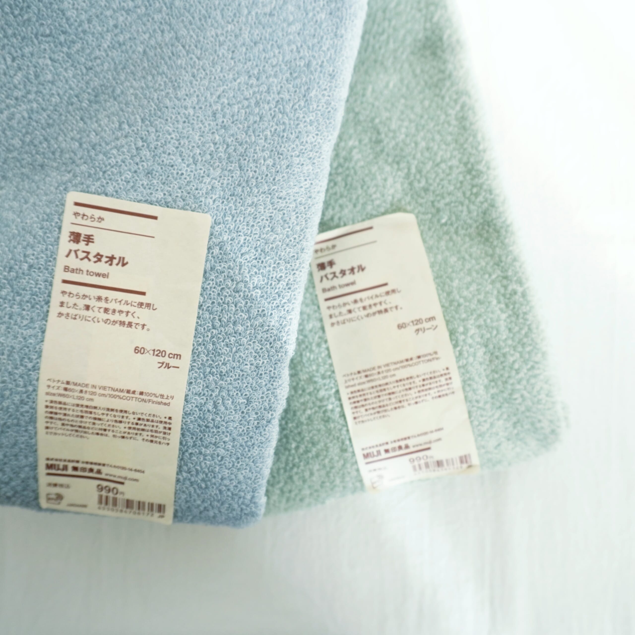 息子2人用に無印良品のバスタオルを購入しました。バスタオルで喧嘩しないように…色を変えてブルーとグリーンを。