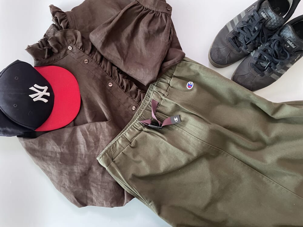 スポーツアイテムに1点華やかなリネンフリルブラウスを投入。