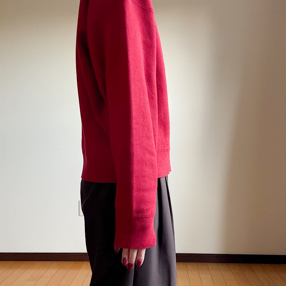 素材がなんとも心地よい!綿100%でニットだけどスウェット感覚で着れる。首元のさりげないデザインも好み。そして、袖がたゆっとする感じもこなれ感出て良き。袖の長さは手の甲が隠れるほど。