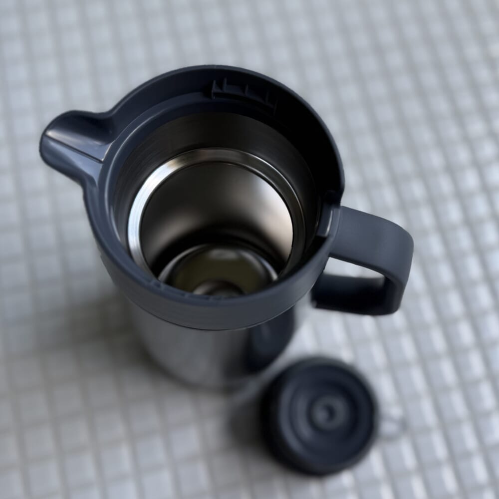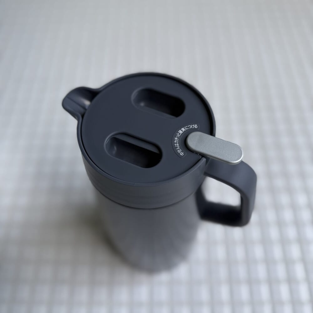 ワンタッチで着脱できる蓋。レバーをプッシュしながら傾ければ中の飲み物が出る構造。