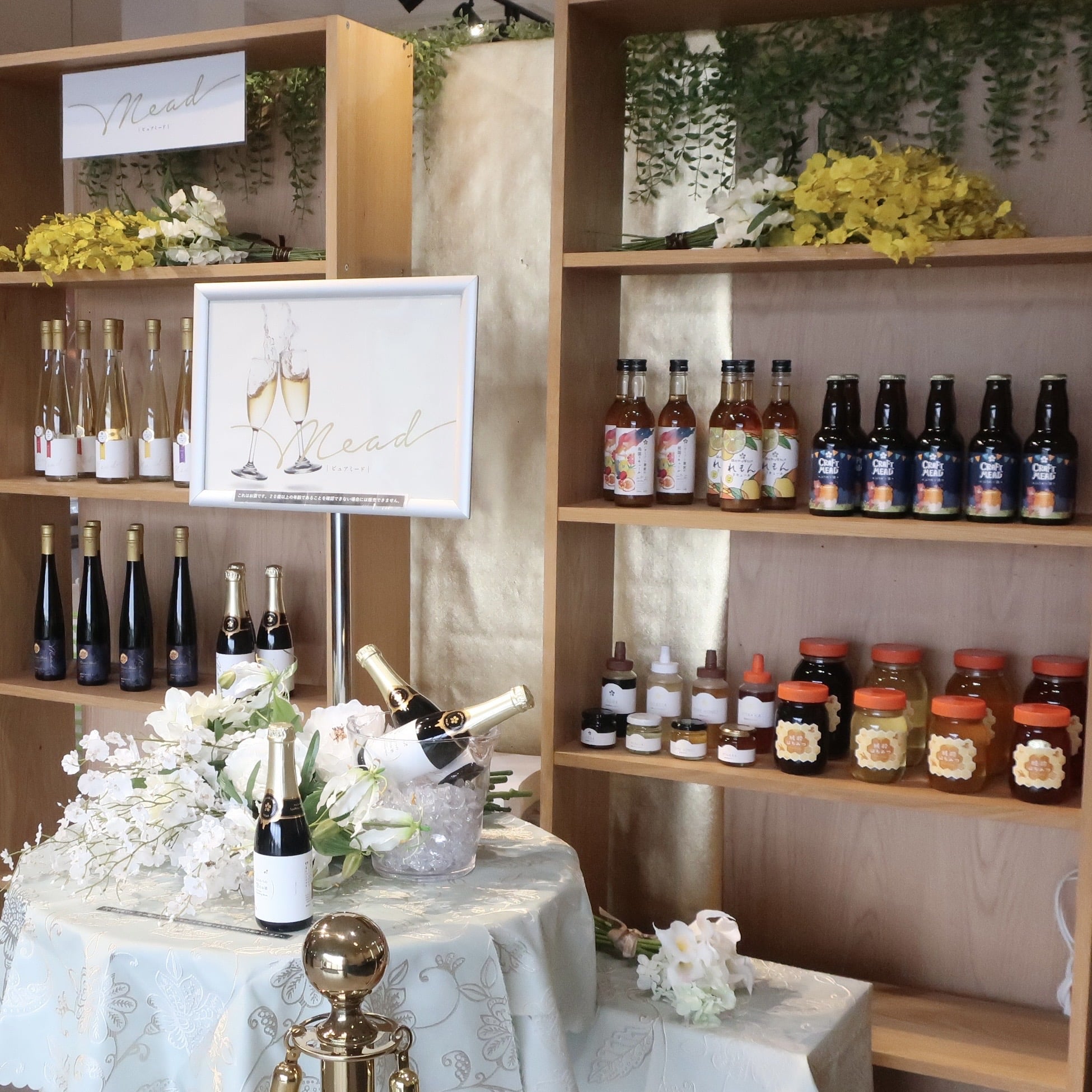 店名の通り、はちみつとミード(はちみつ酒)の瓶がずらりと並び、光を受けてきらきら。