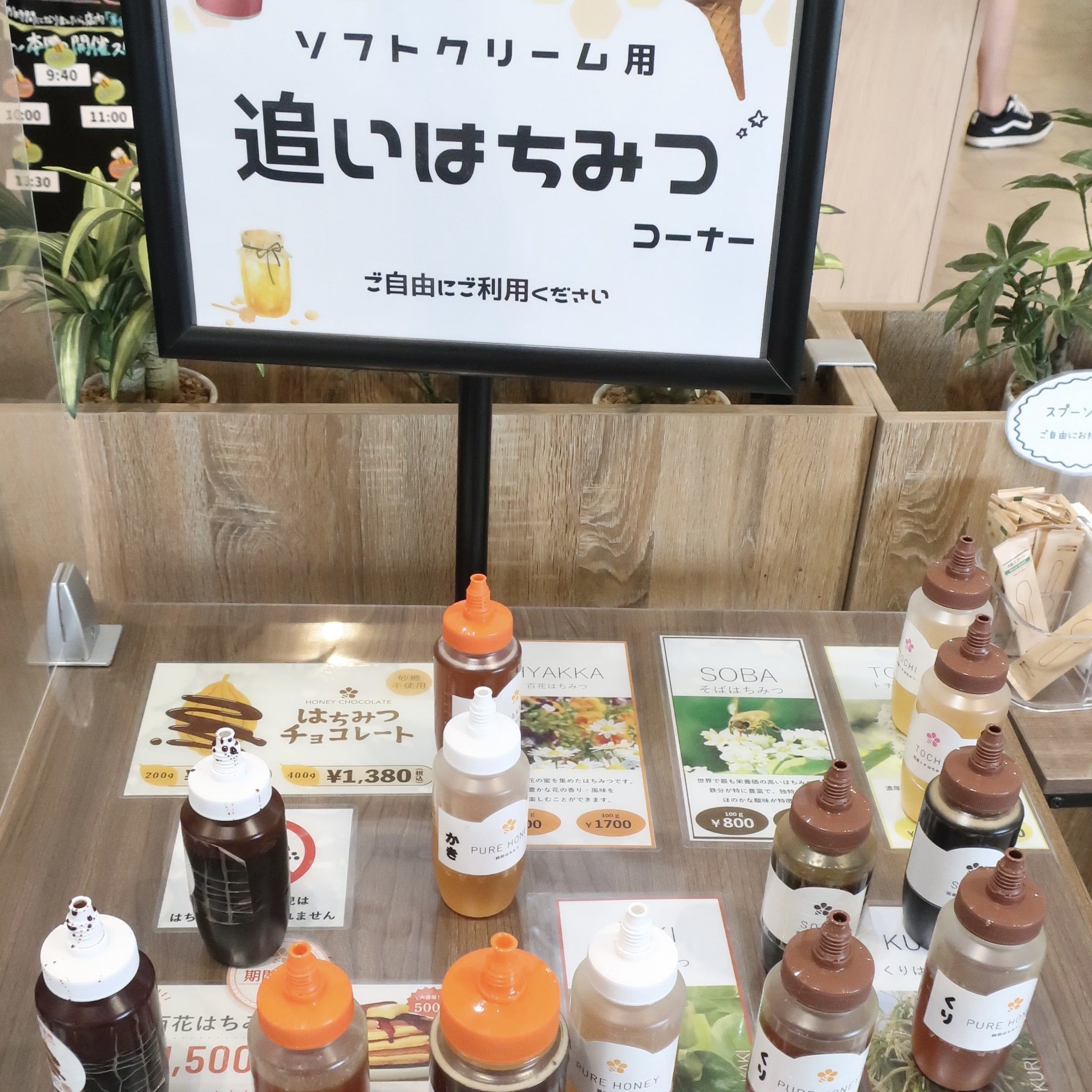 お客様が多かったので試食コーナーの写真は撮っていないのですが、使い捨てスプーンが置いてあり、様々な種類のはちみつのボトルが置いてあるので自由に味わえます。