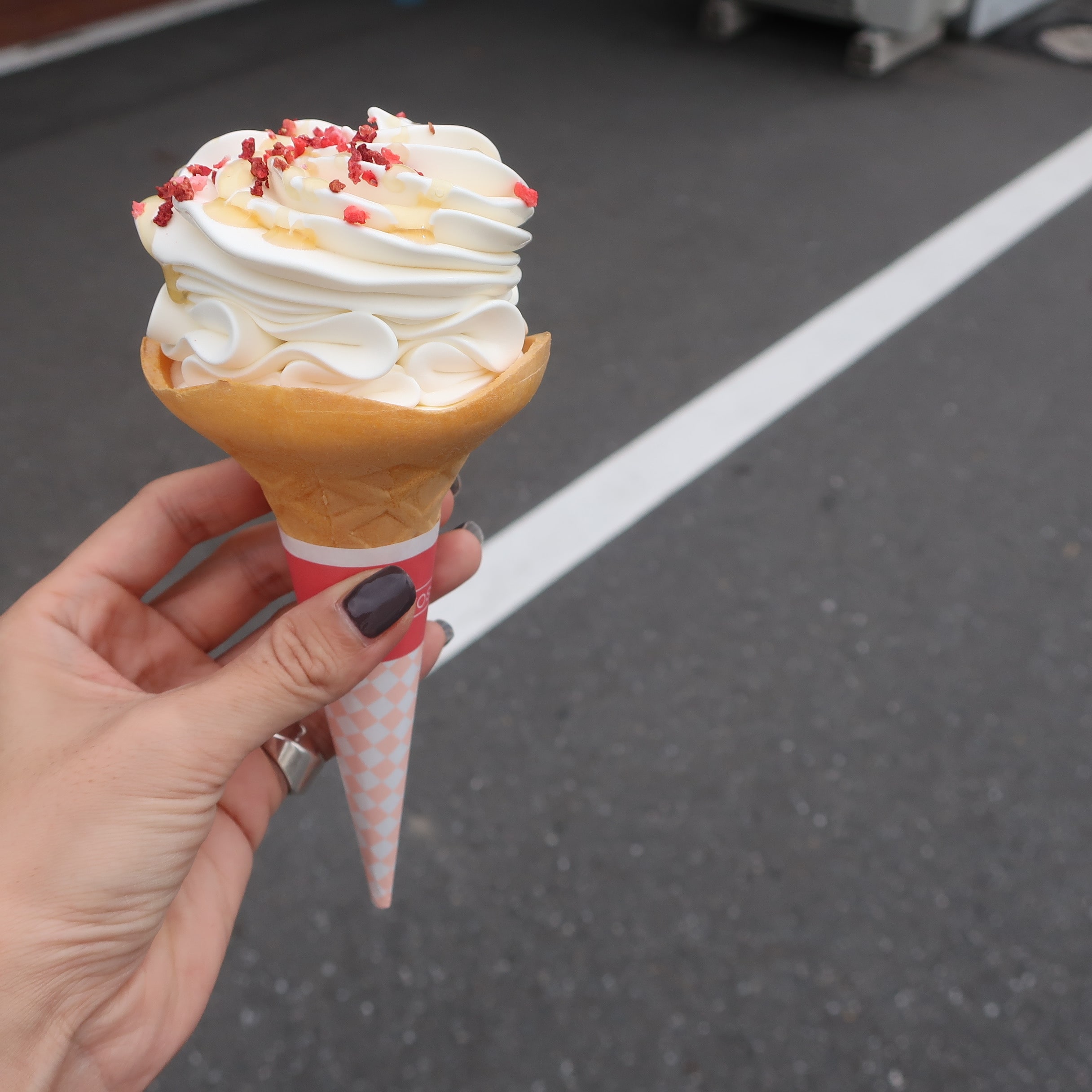 濃厚なミルク味のソフトに、はちみつとフリーズドライのベリーをトッピング。