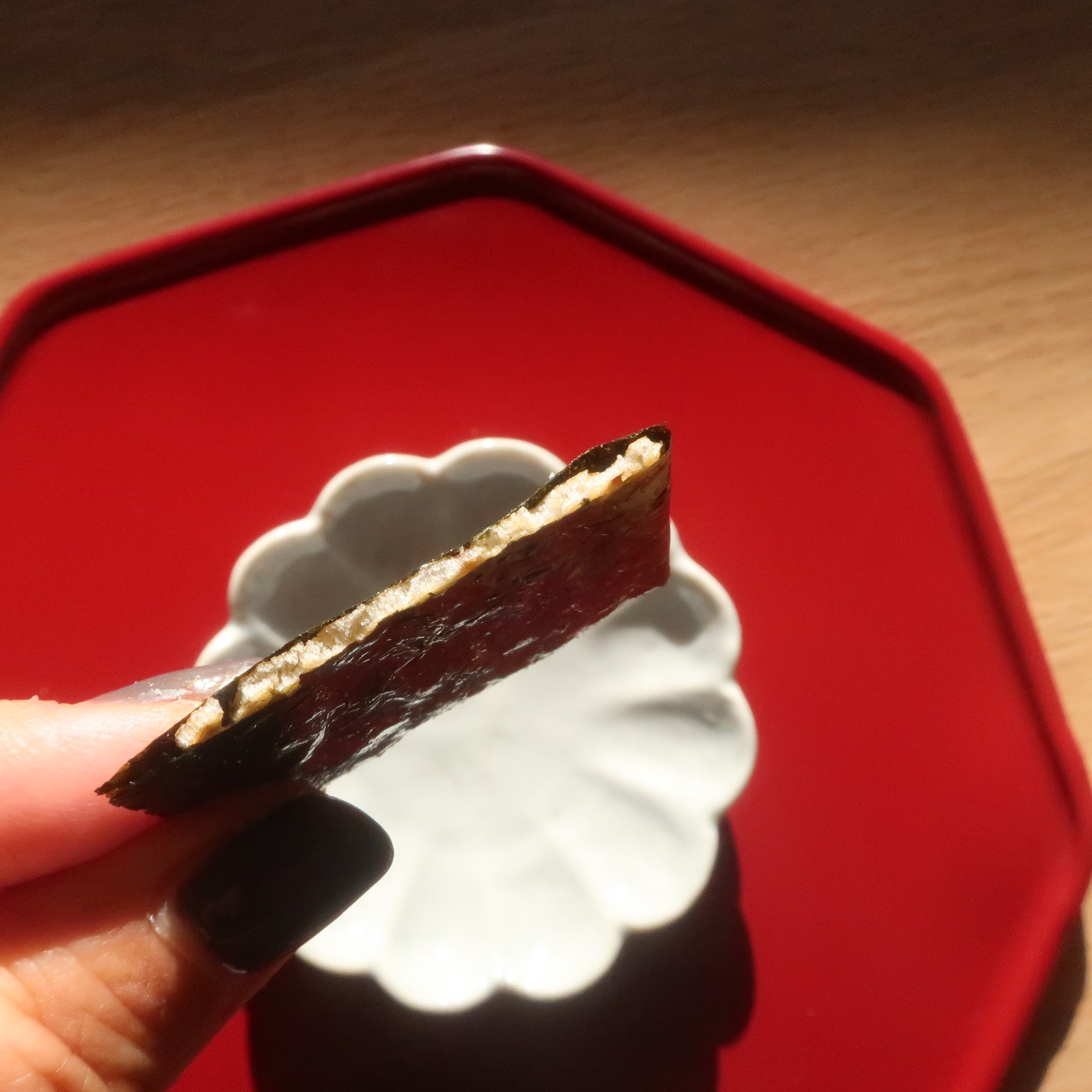 パリッパリの海苔の中に、極薄のおかきが入っていて♡香ばしさも食感も最高。お茶のお供にぴったりです。