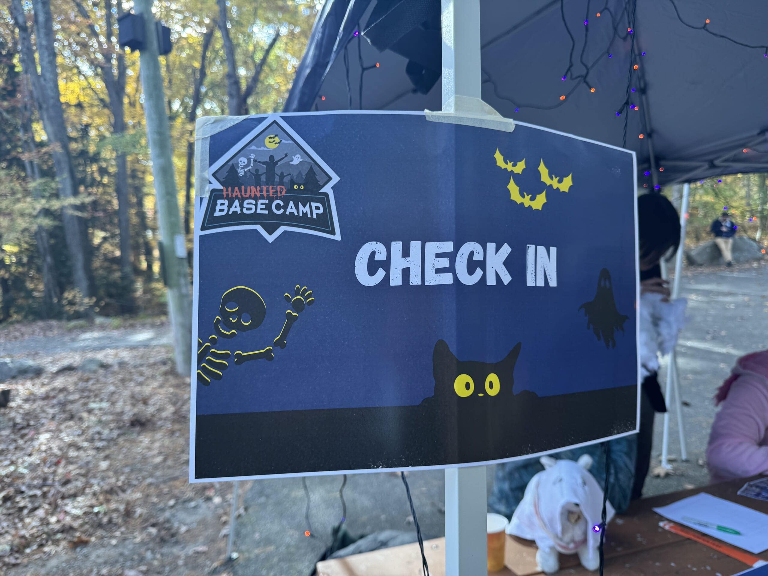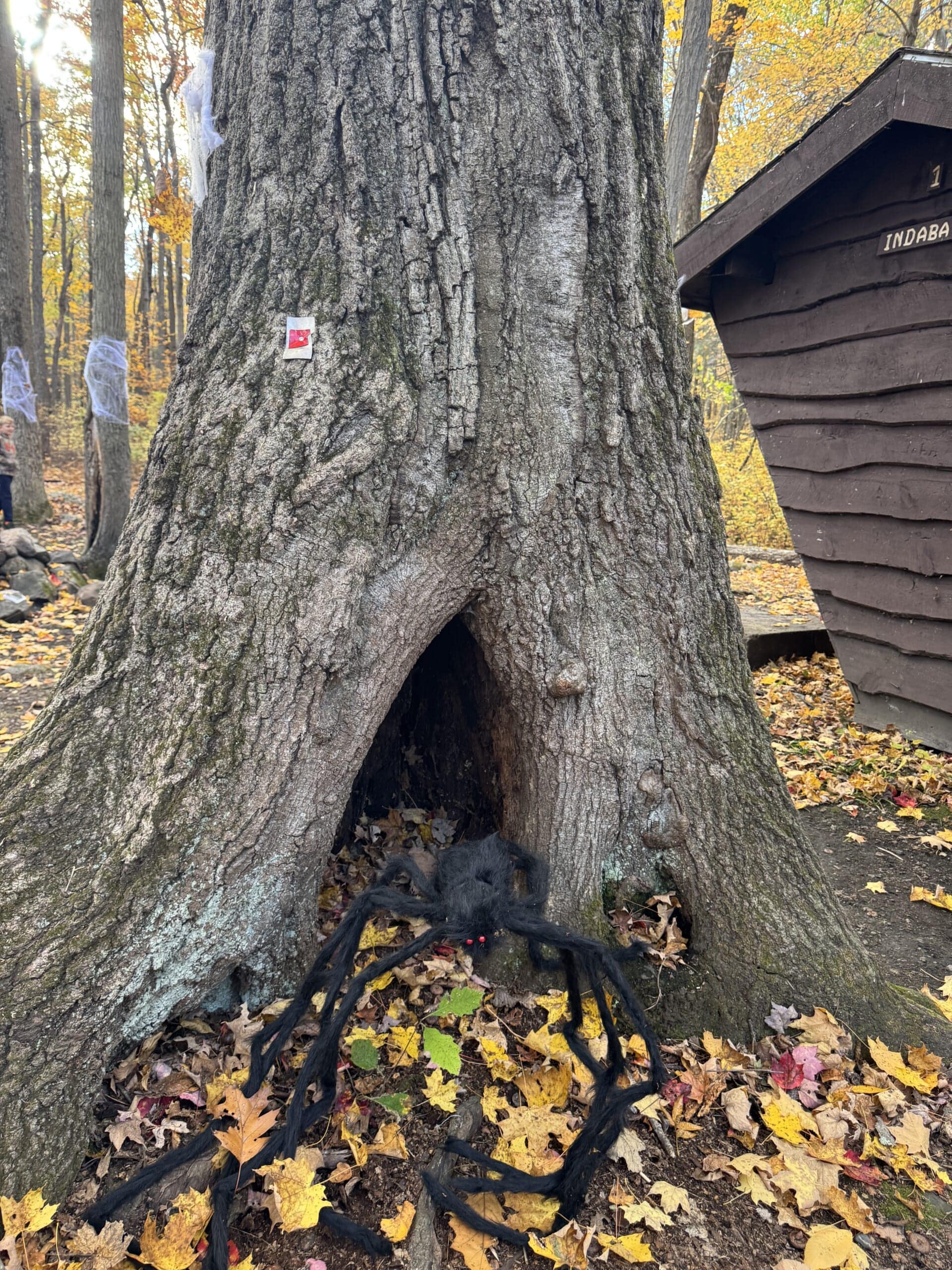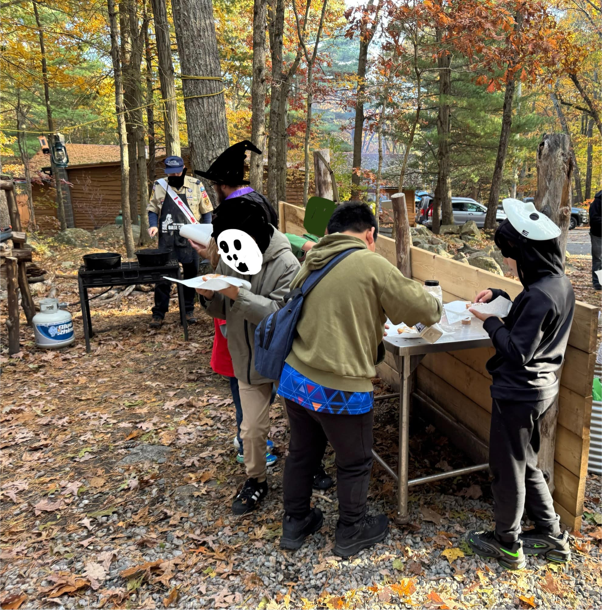 ツアーとして15分おきにリーダーについて森を歩いていくイベントで、カブスカウト年齢対象なのでお化けが追いかけてくることはなく、叫んだりしているお化けの横を見て歩く森のお化け屋敷でした。