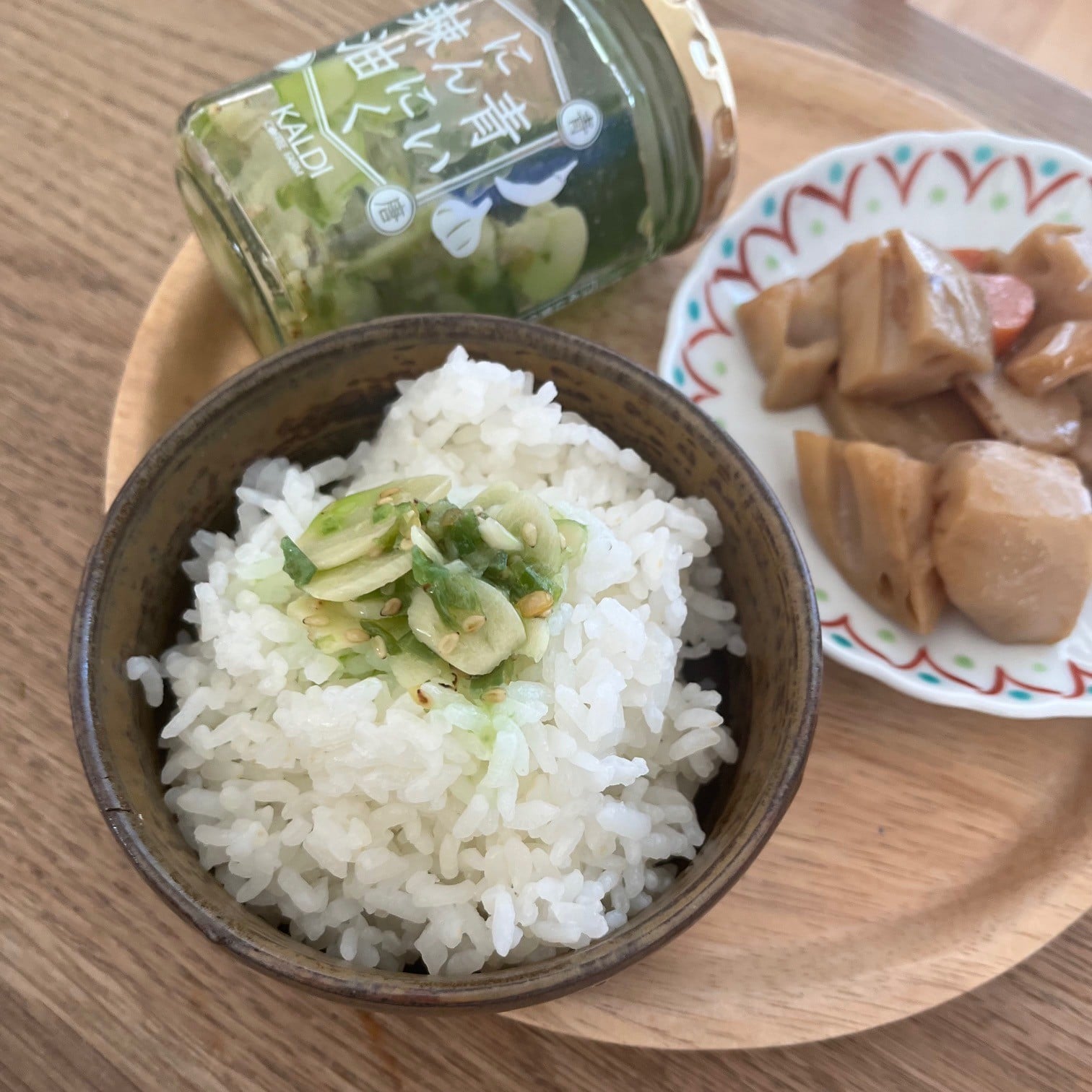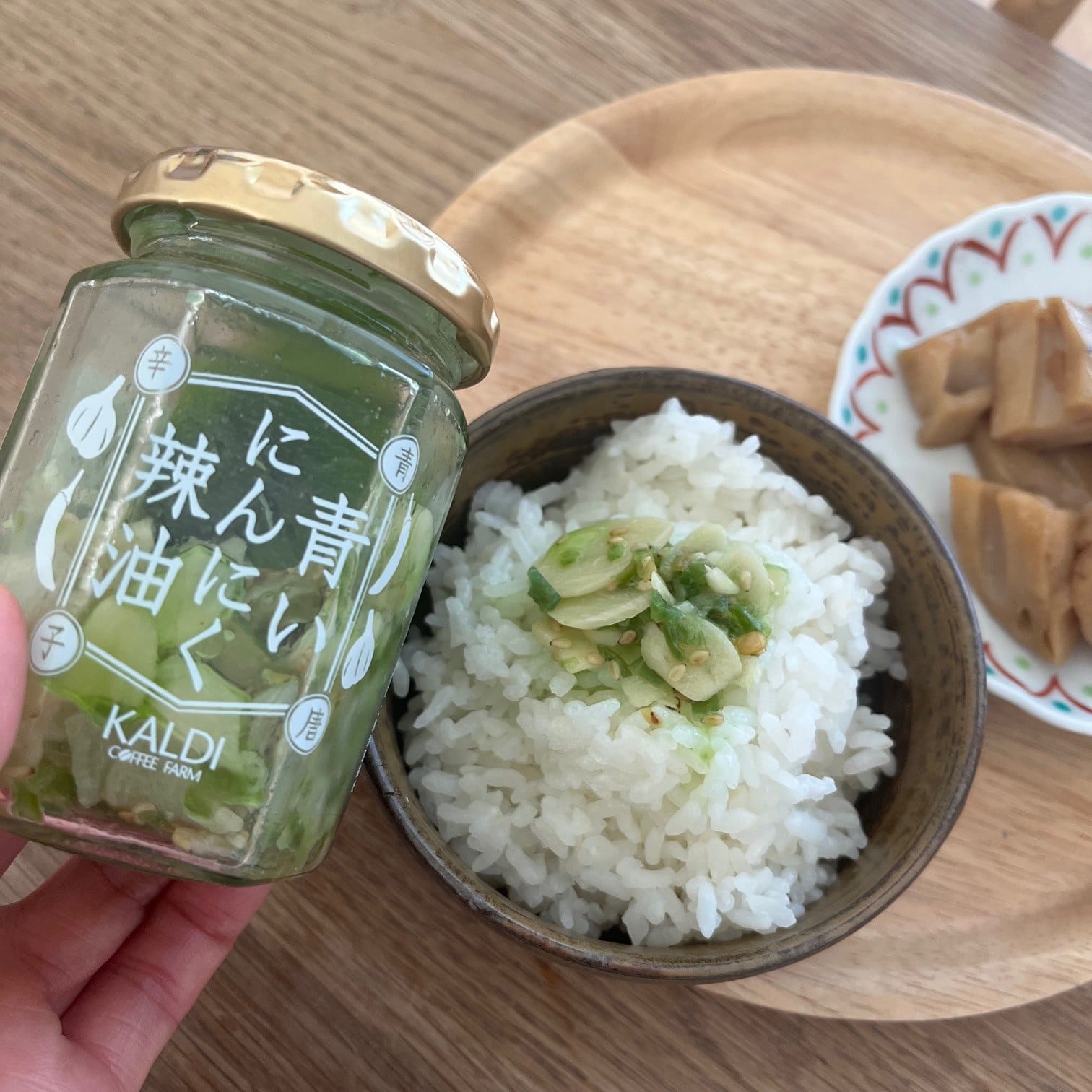 カルディで購入した「青いにんにく辣油」がおいしくて、地元産の新米と一緒に楽しんでます♩