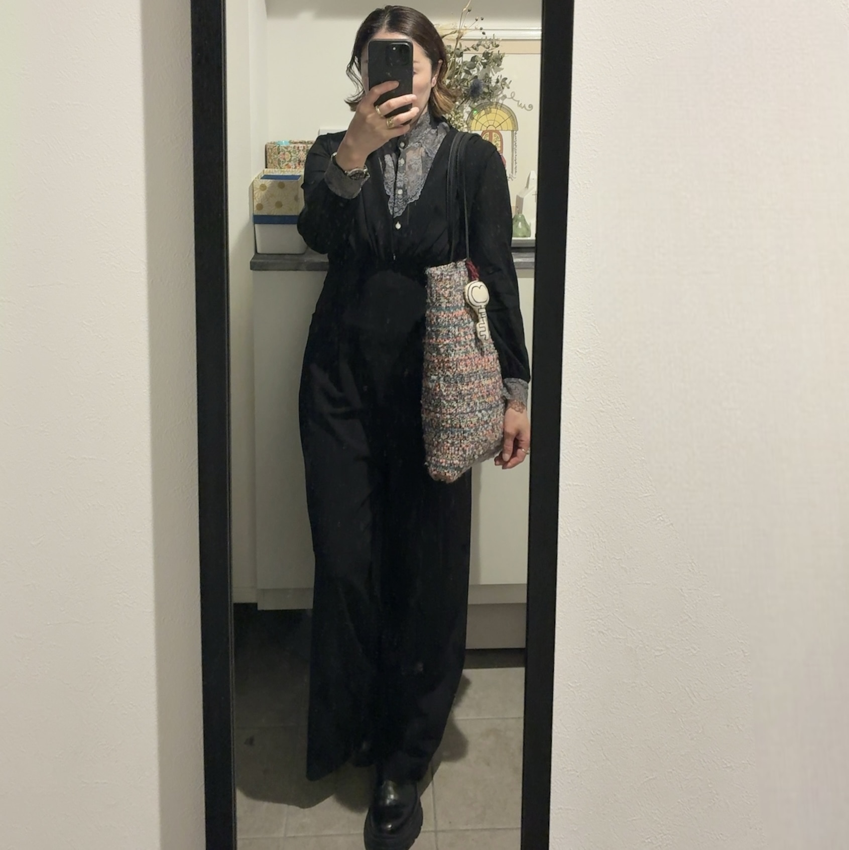 この日は友人の個展のお手伝いで一日接客をしていたので、綺麗めな装い。グレーのレースが気に入っているブラウスにウール素材のオールインワンをレイヤードしました。互いに7、8年愛用しているアイテムですが、このコーディネートをした記憶はなく、自分の中では新鮮なスタイリングでした。