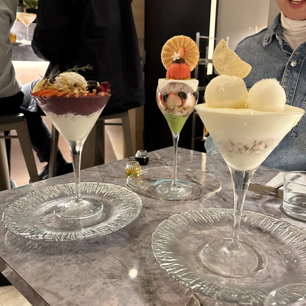 左からチビうさの『アサイーパフェ』、中央があいみの『いちごと和』、娘ちゃんがソフトクリームを食べました。女子のパフェは別腹。全員ペロリ。笑