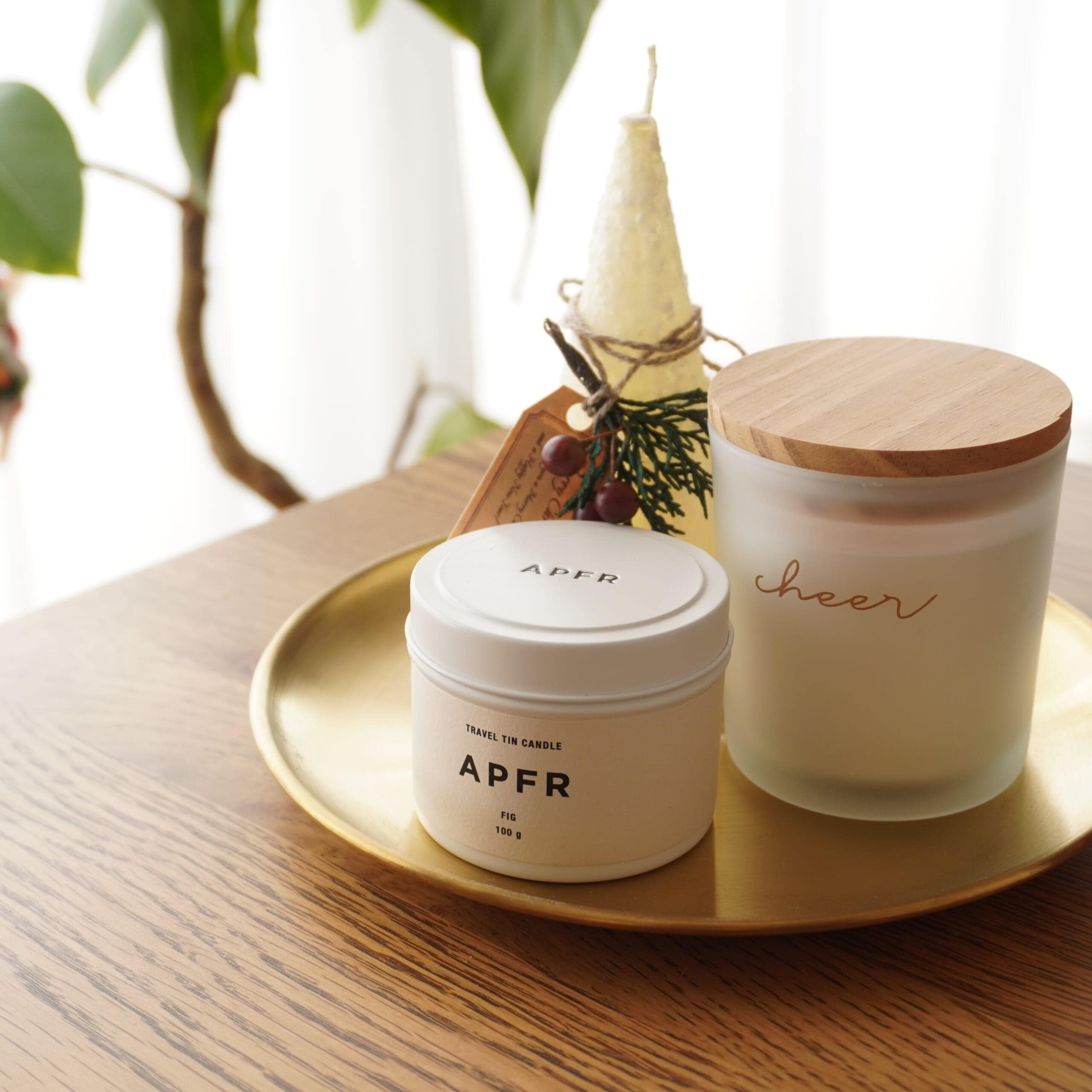 大きめサイズの丸型トレーにはキャンドルを置いてリビングに。