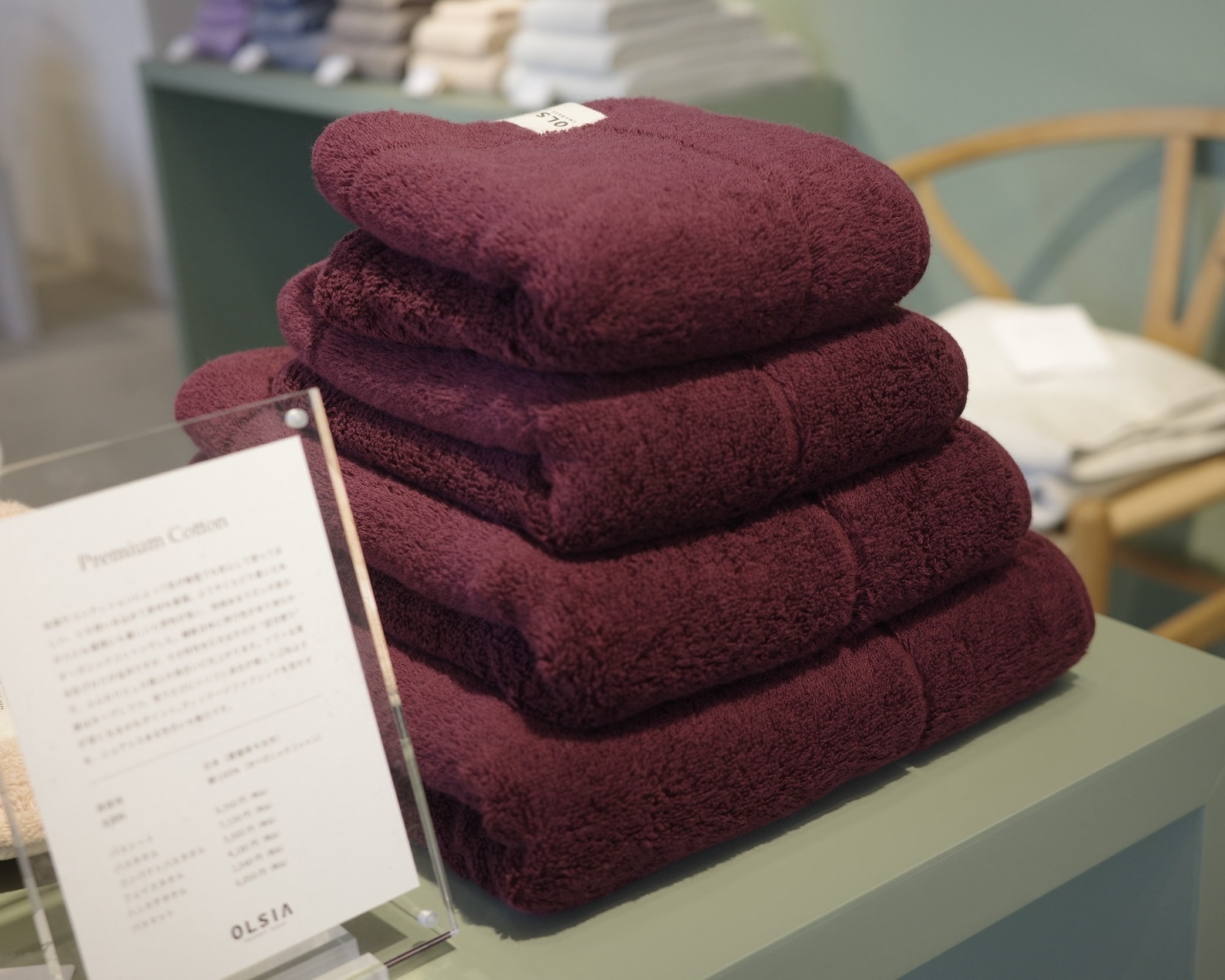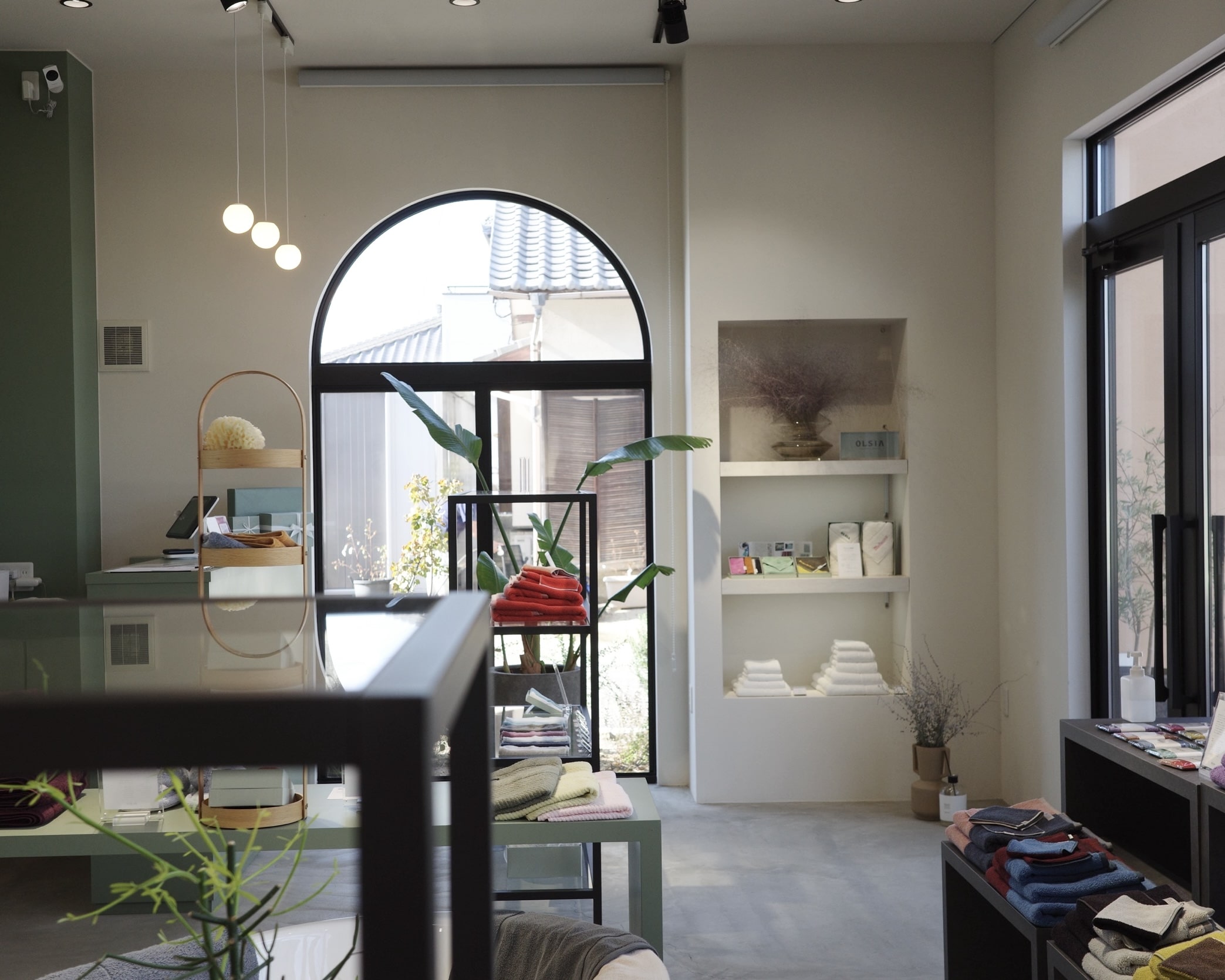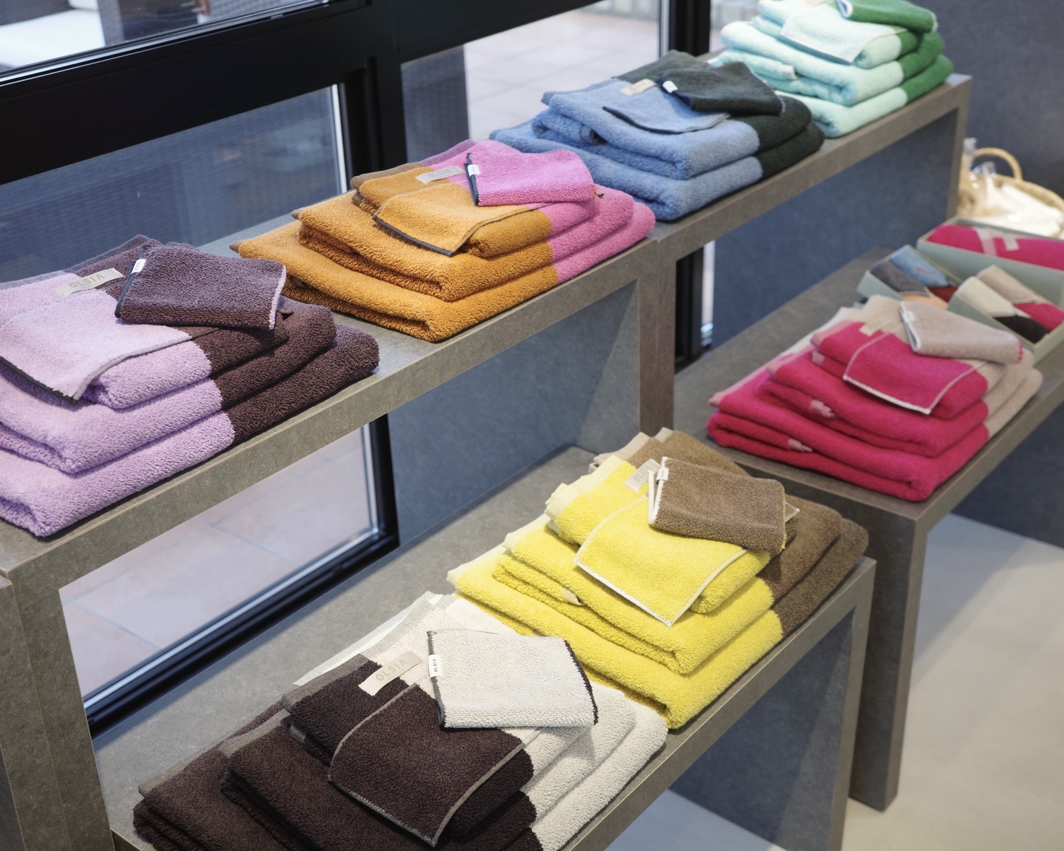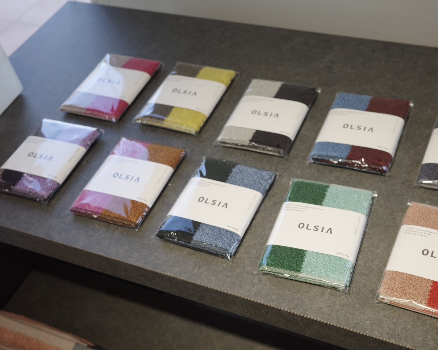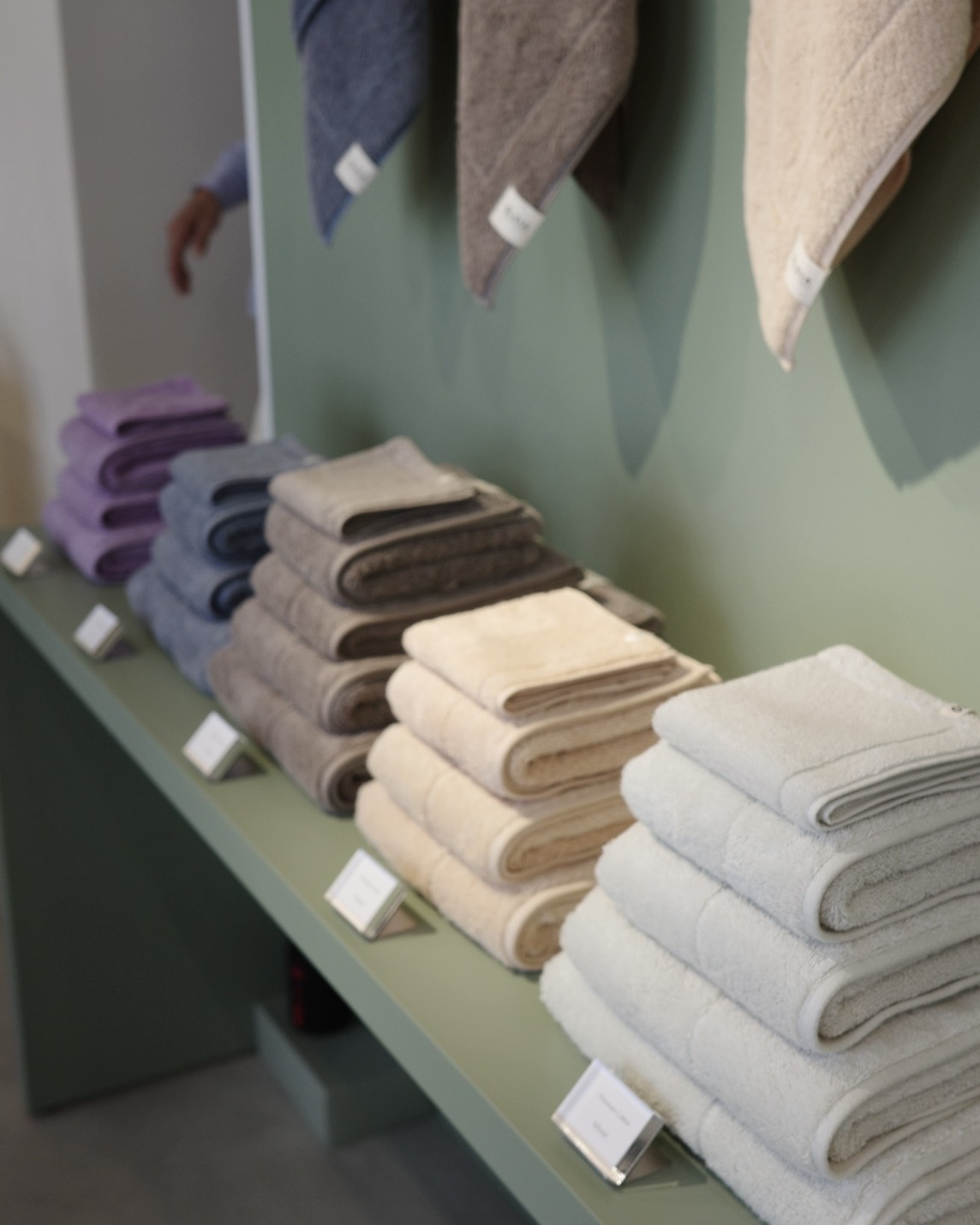 色とりどりのOLSIAタオルやバスローブ、スリッパなどが美しくディスプレイされた店内。OLSIAカラー(?)のセージっぽいグリーンの壁も印象的です。