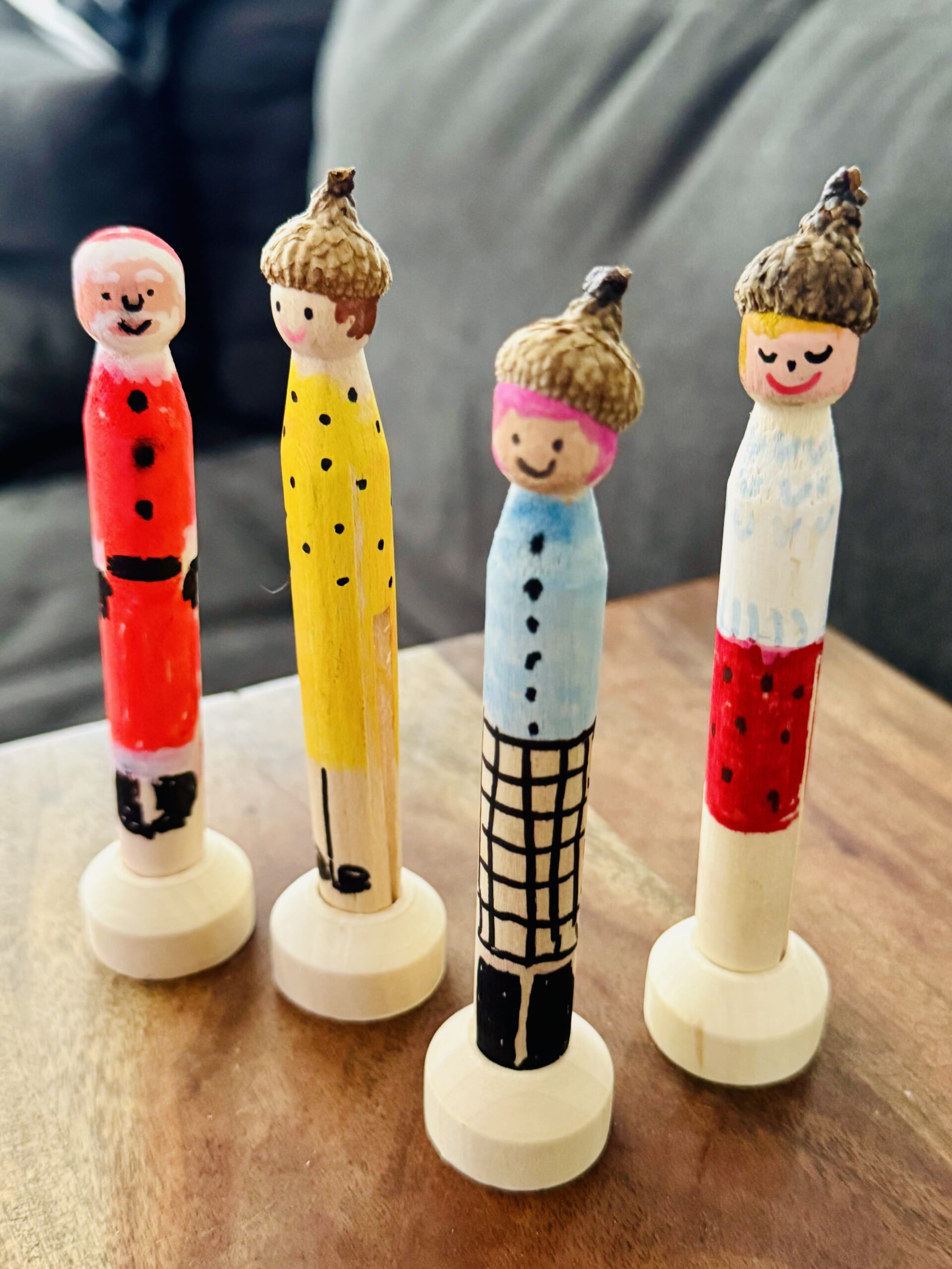 作り方は木製洗濯バサミの顔とボディをアクリルマーカーで書き込んで、どんぐりのキャップをボンドで頭に貼り付けるだけ。アクリルマーカーは日本だとポスカが有名ですね。不透明でわりと何の上でも描けるのでクラフトにピッタリ。顔や服の柄は油性ペンでもなんでも大丈夫。