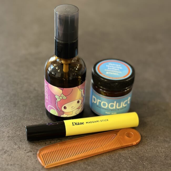 ・ダイアンのマエガミスティック・・・頭頂部にヘアオイルをつけるとギトギトして見えてしまうので、アホ毛対策にはスティックタイプのスタイリング剤を愛用。 気になる部分だけをピンポイントで整えられるのが便利です。