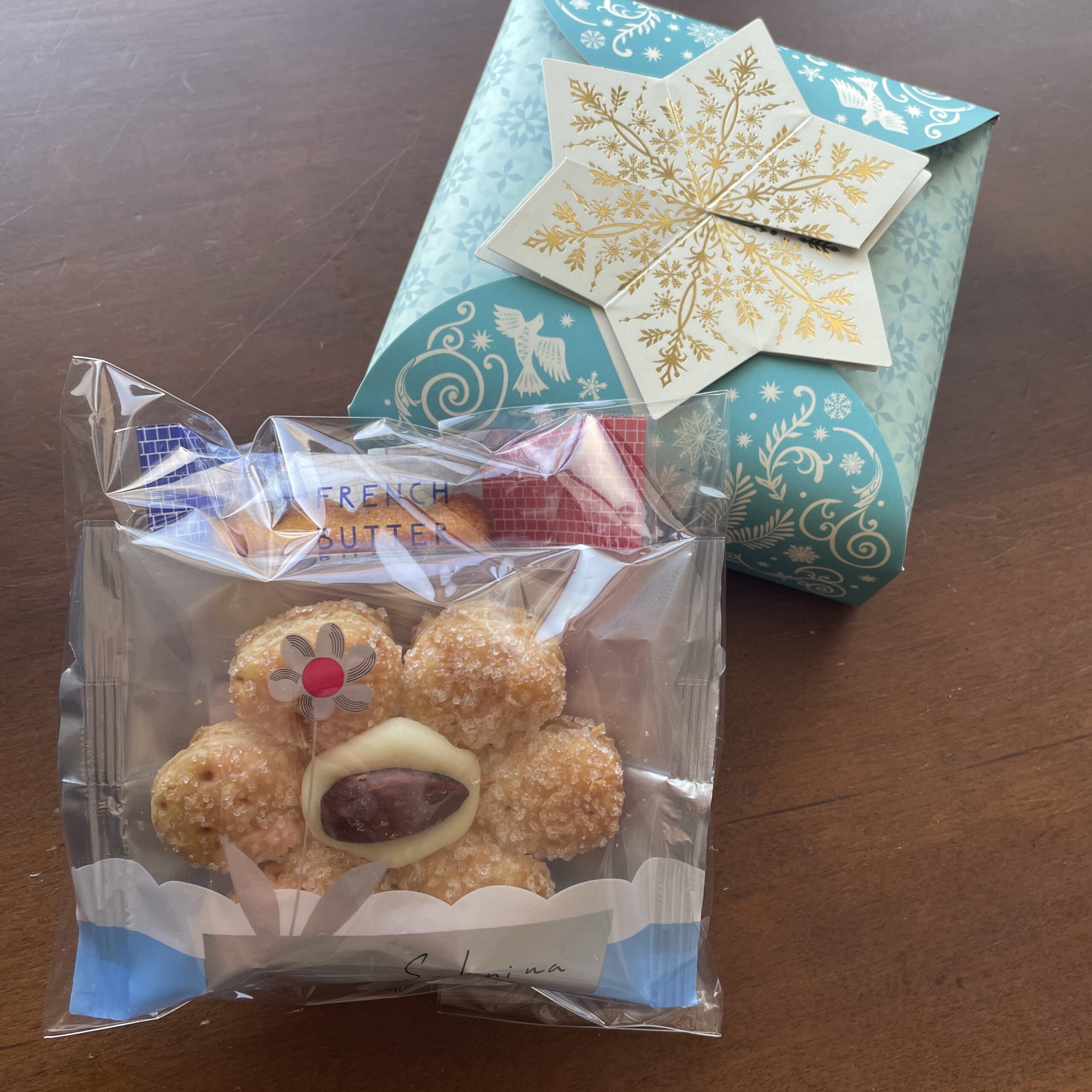 本当は詰め合わせを選びたかったのですが、詰め合わせはなかったので、個々で購入した「アンヴェルセ」と「薫るフレンチバター」を組み合わせて、バター菓子に合いそうなルピシアのクリスマスのティーセットを添えました。