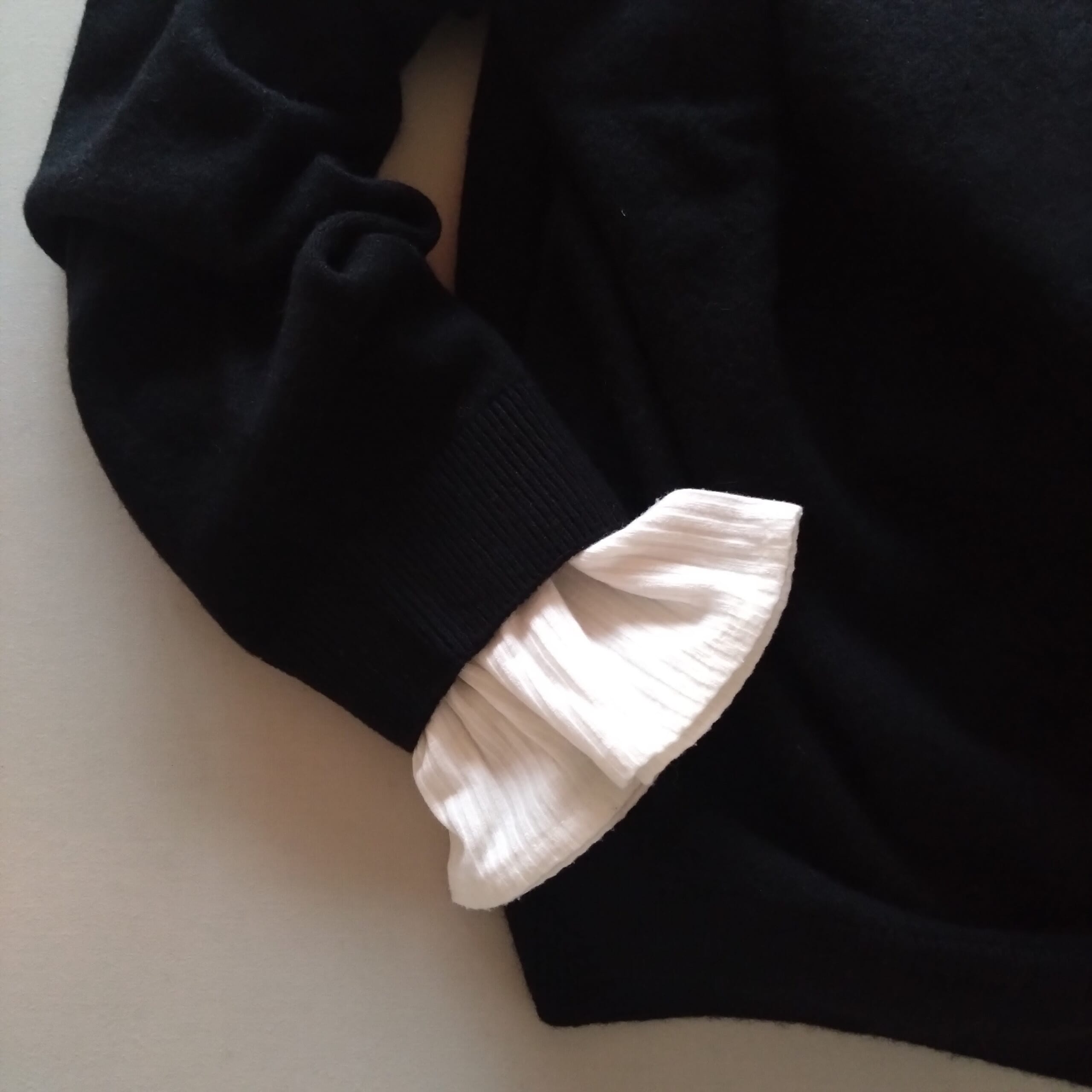 ざっくりめのカーディガンなのでちょっと長め丈になるのがかわいい。ひらひらが邪魔だな、と思った時はカーディガンのリブにしまい込んじゃう。
