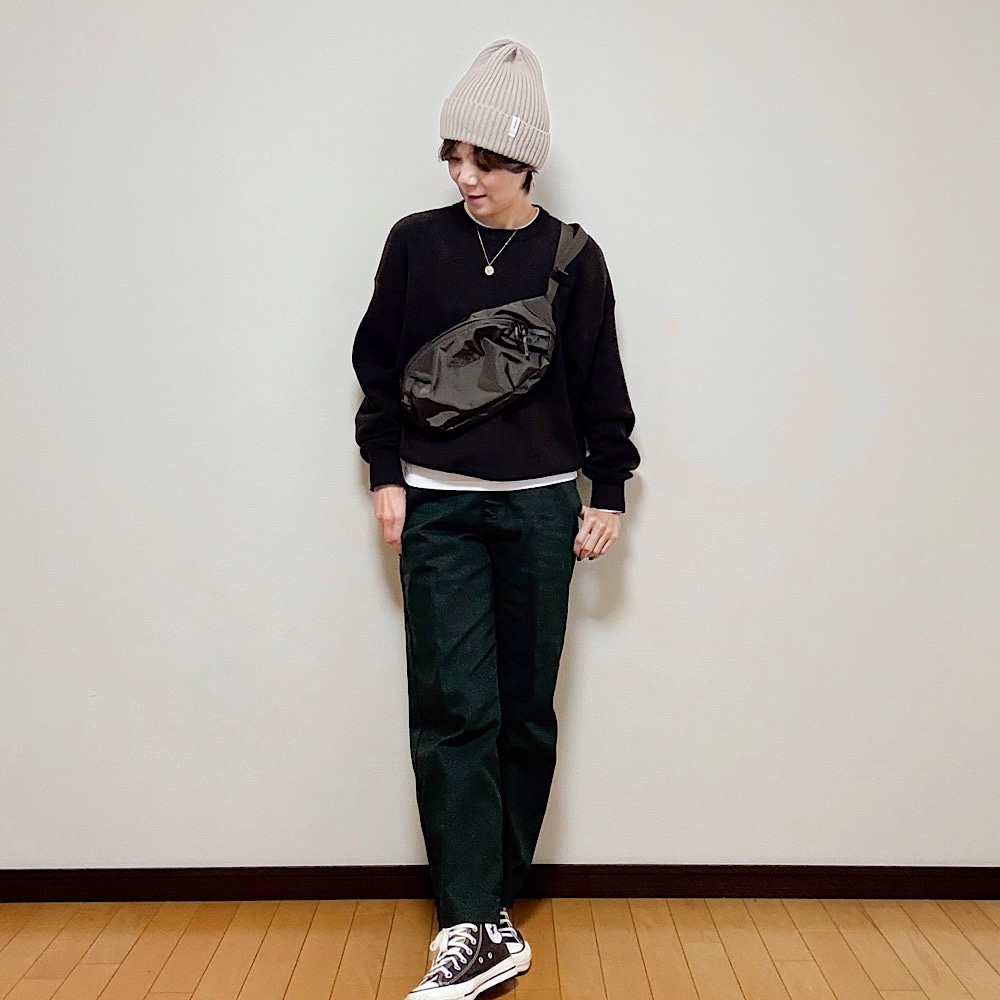 ニット帽&ウェストバッグ、コンバースとカジュアルアイテムを足して、カジュアルスタイルに。色のトーンが落ち着いているおかげで、THEカジュアルにはならない!?