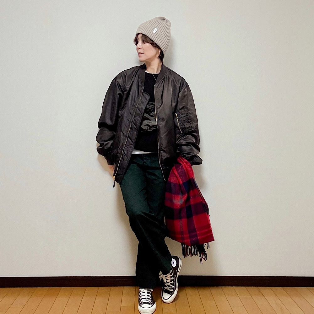 今季購入した赤チェック柄のストールを足して、アクセントに♪