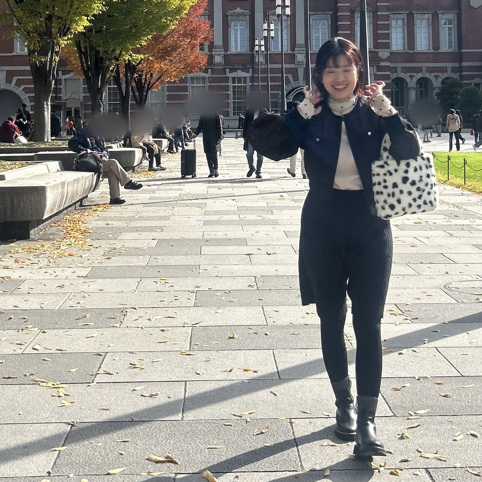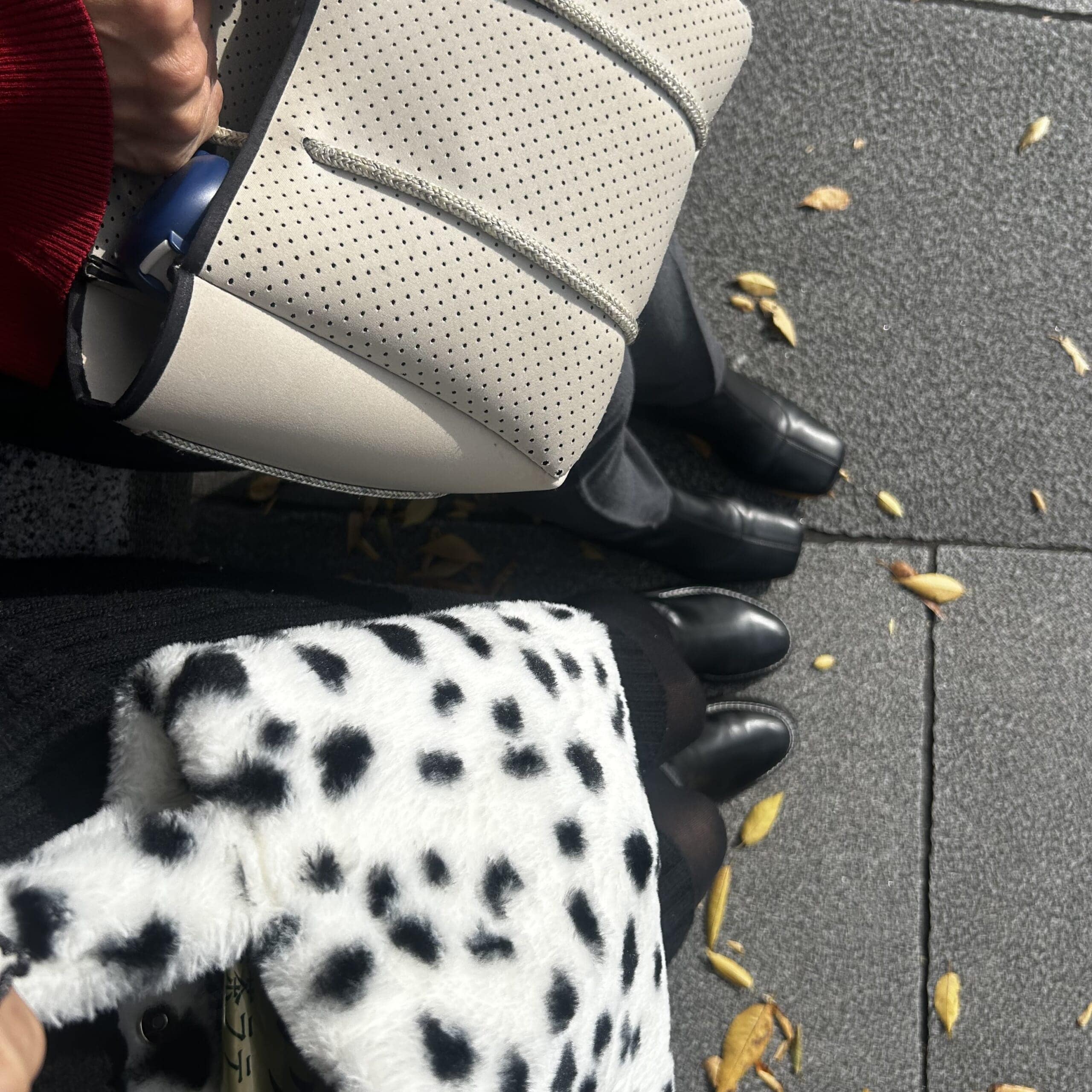 小物は、ファーのアニマル柄バッグに黒タイツ×黒ブーツ。枯葉を踏む足元に、しっかり秋を感じる組み合わせにしました。