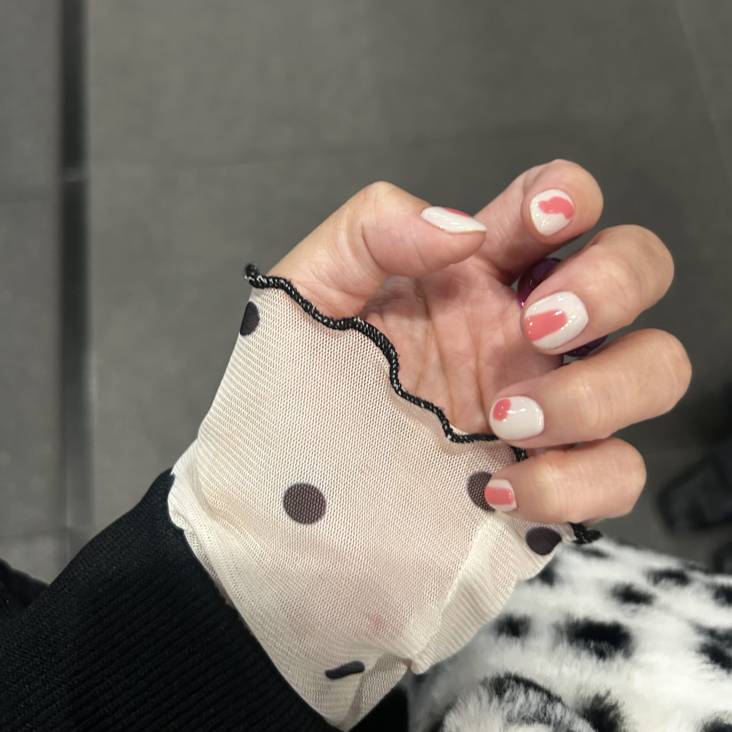 ネイルは、メロウな袖に映える“オフホワイト×ピンク”のポップなデザイン。