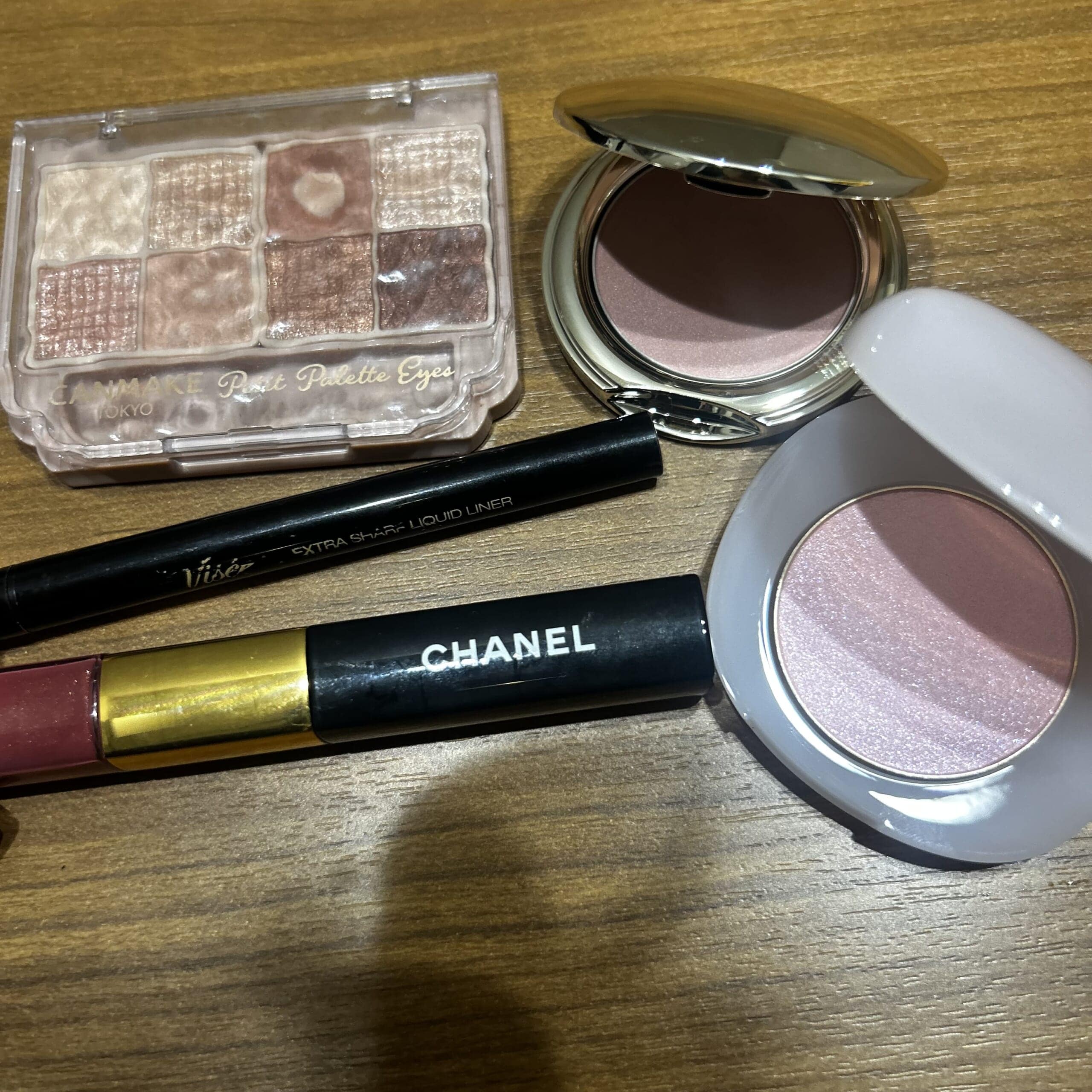 メイクは、キャンメイクのアイシャドウとヴィセのアイライナーで作るマットアイ。チークはスナイデルの2色使いで血色ツヤ肌に。