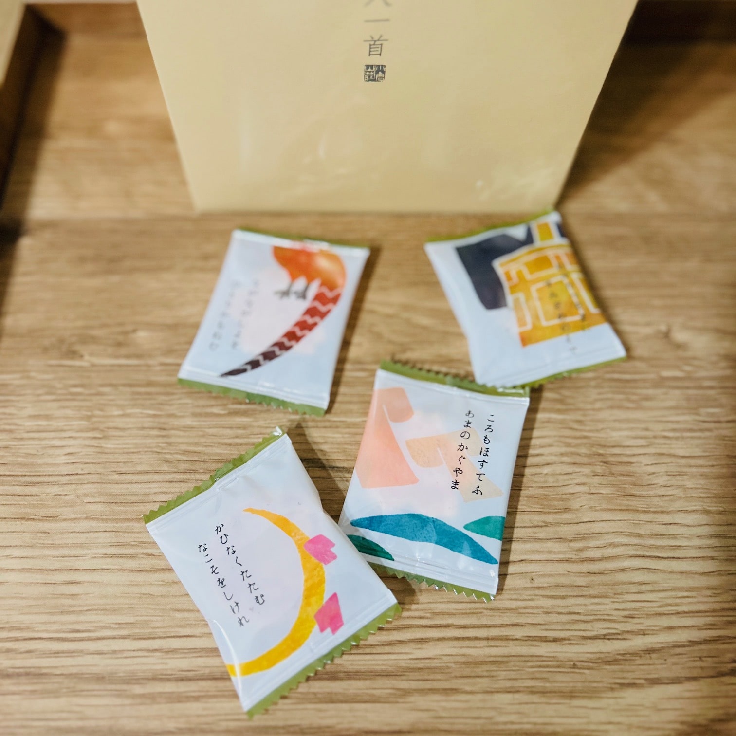 こちらも京都で有名な小倉山荘のあられ・おせんべい達。10種のあられ・おせんべいが100首の和歌に因んだデザインで包まれています。