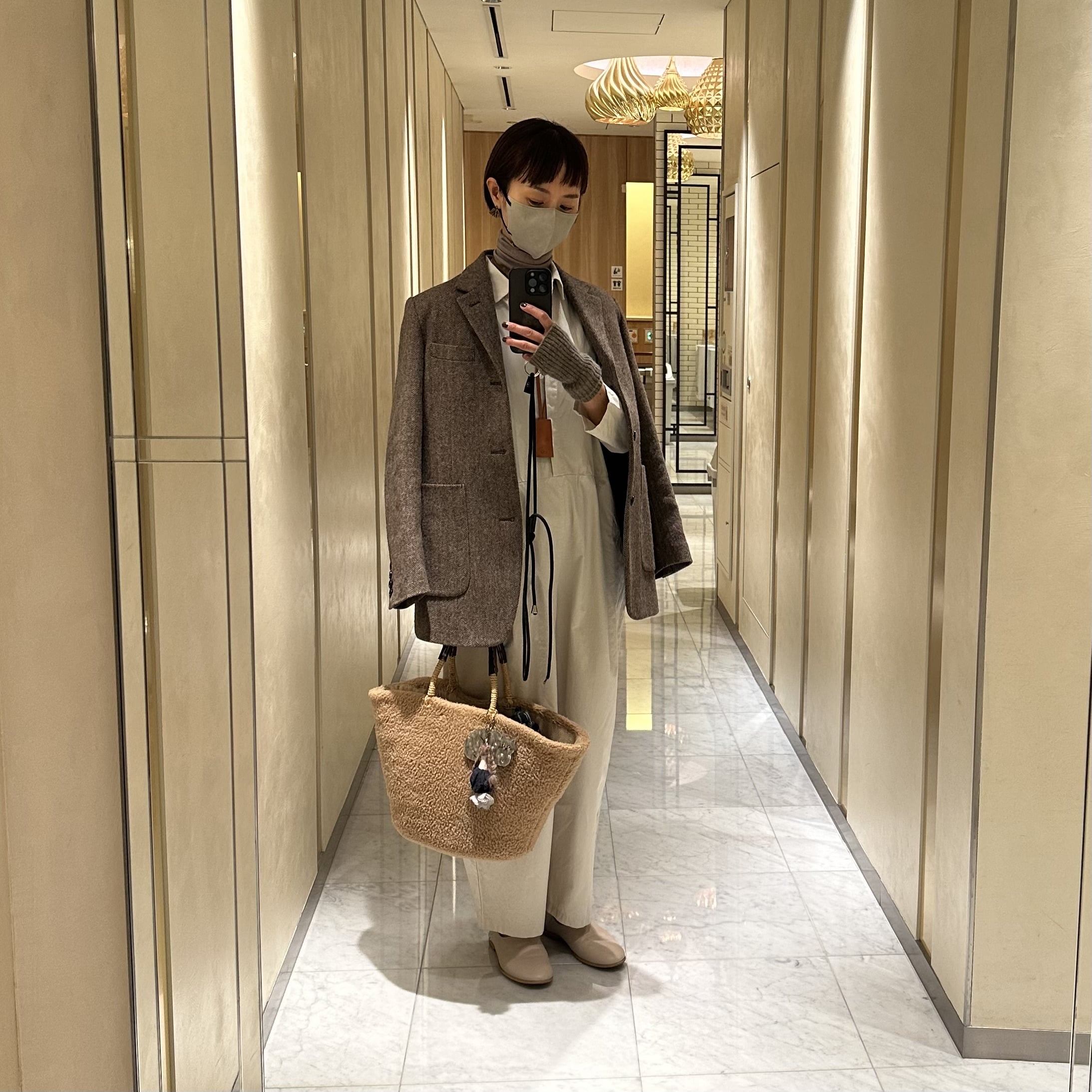 今年もパーティー当日コーデの候補にあがっていたものの、ホワイトカラーでもしソース等をこぼしてしまったらどうしよう…と不安になりまして前日の集まりに着て行くことに。インナーにはソージュの薄手タートルを合わせましたがこの日はぽかぽか陽気でちょっと暑かった(汗)。