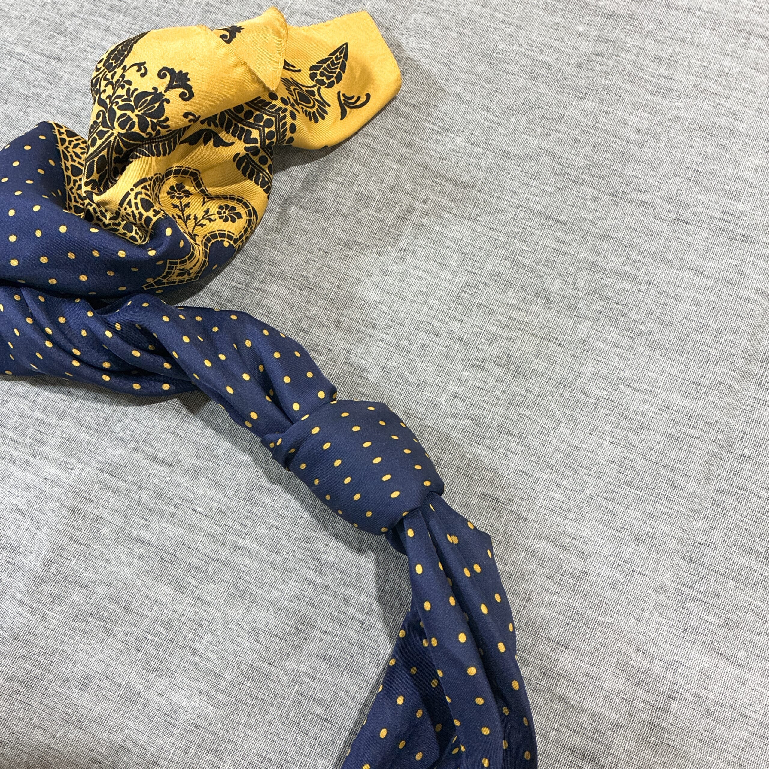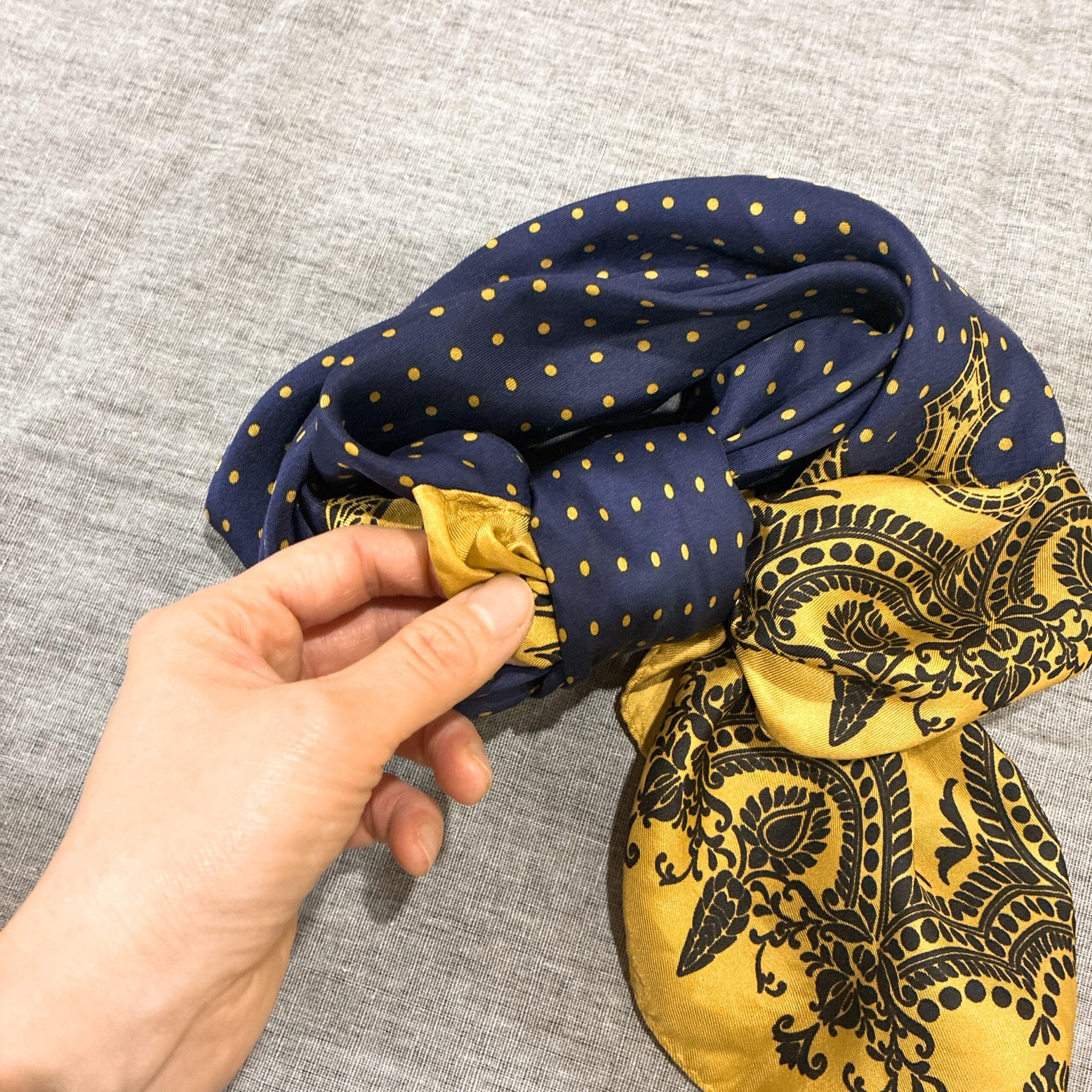 棒状に折りたたんだスカーフの中央部分に結び目をひとつ作ります。