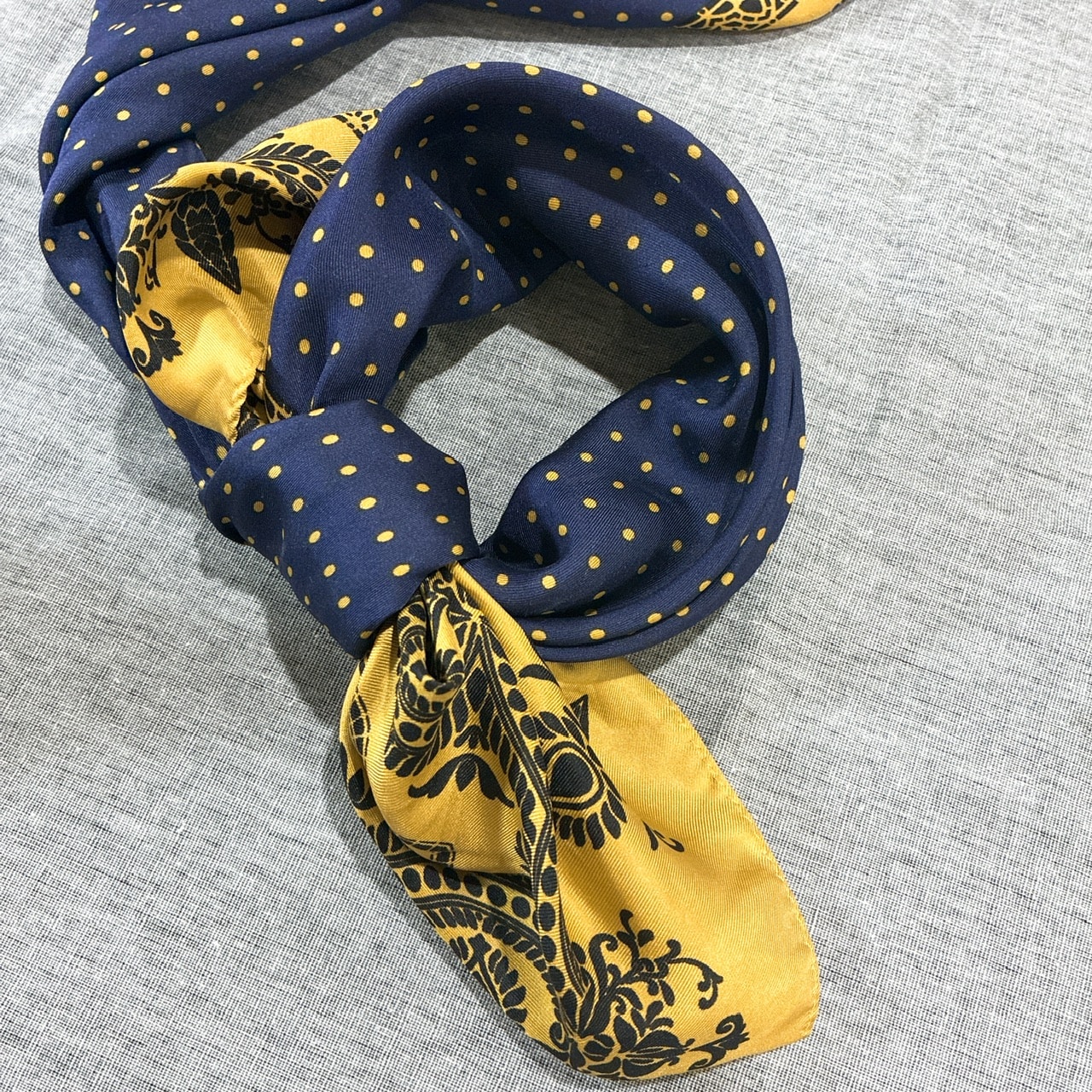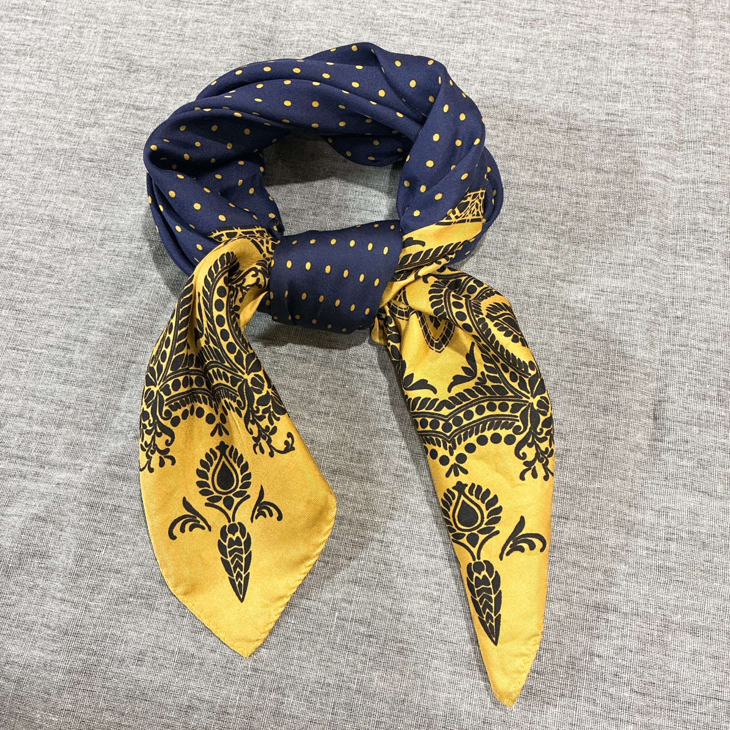 このスカーフは10年以上前に買ったアダムエロペのシルクスカーフですが、合わせやすくて飽きがこず、これからも愛用したいと思っています。