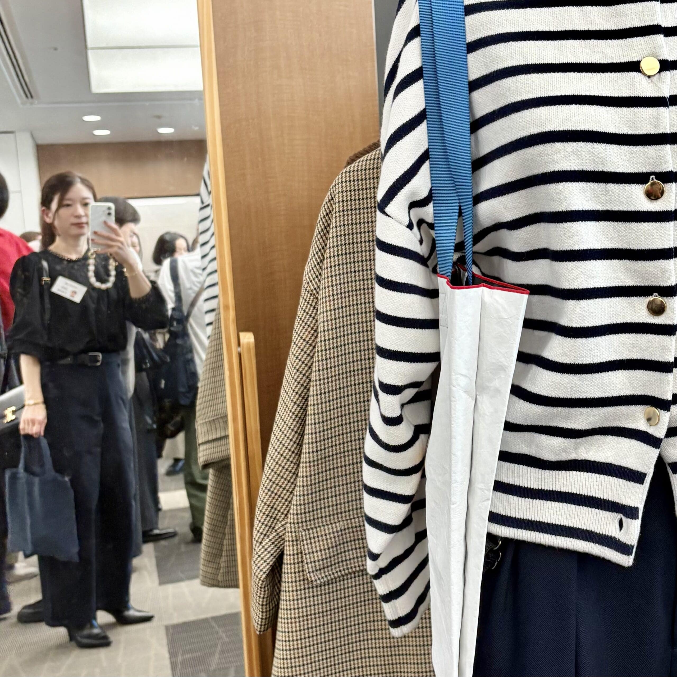 さてここで、LEEマルシェのブースで鏡に写り込んだ写真と共に、パーティーの「今日なに着てる?」です。