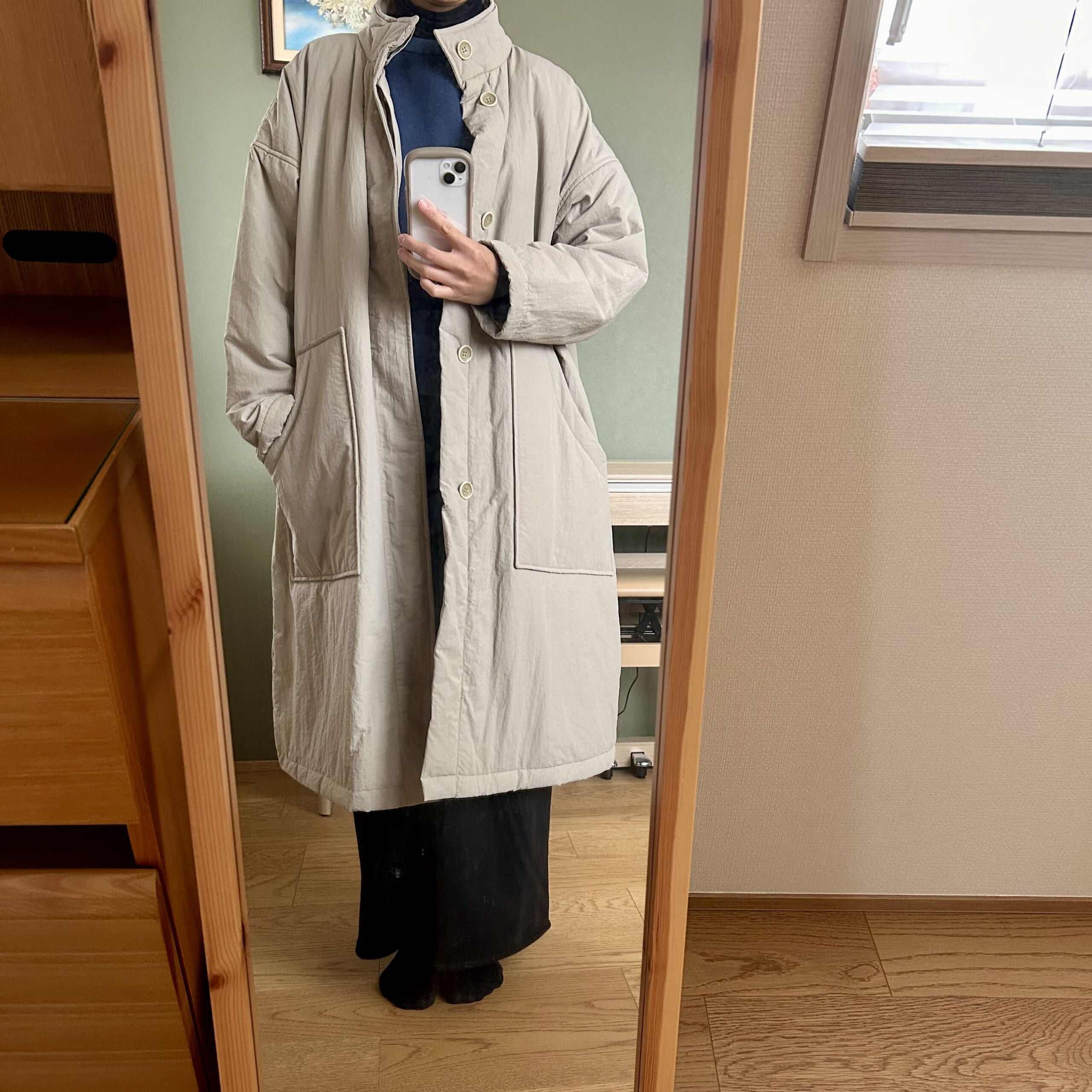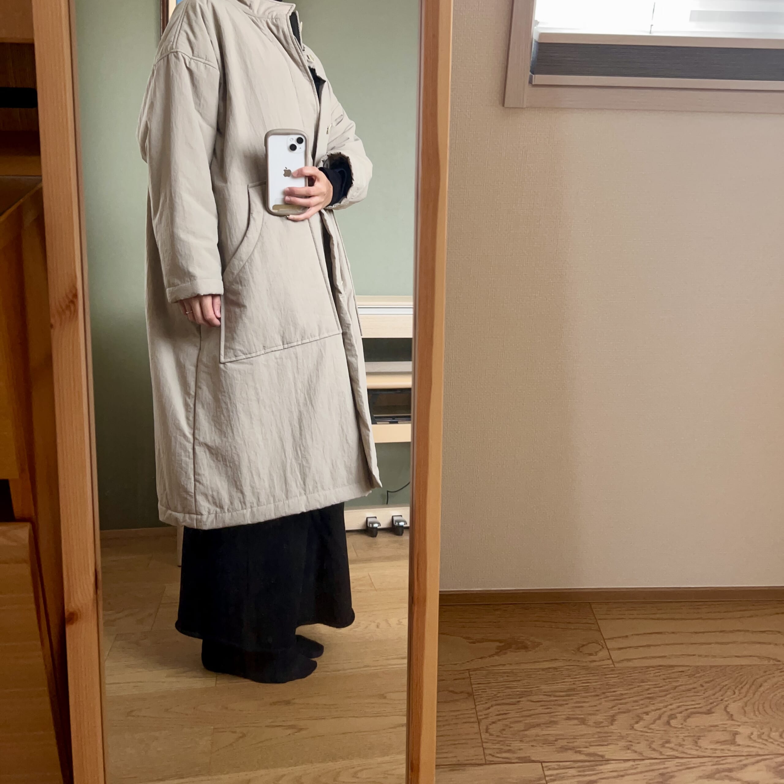 私が購入した中綿入りコートは、生地に落ち着きのあるマットなナイロンが使用されています。そして全体に中綿が入っているのですが、薄手なので着ぶくれせずスッキリ着られます。